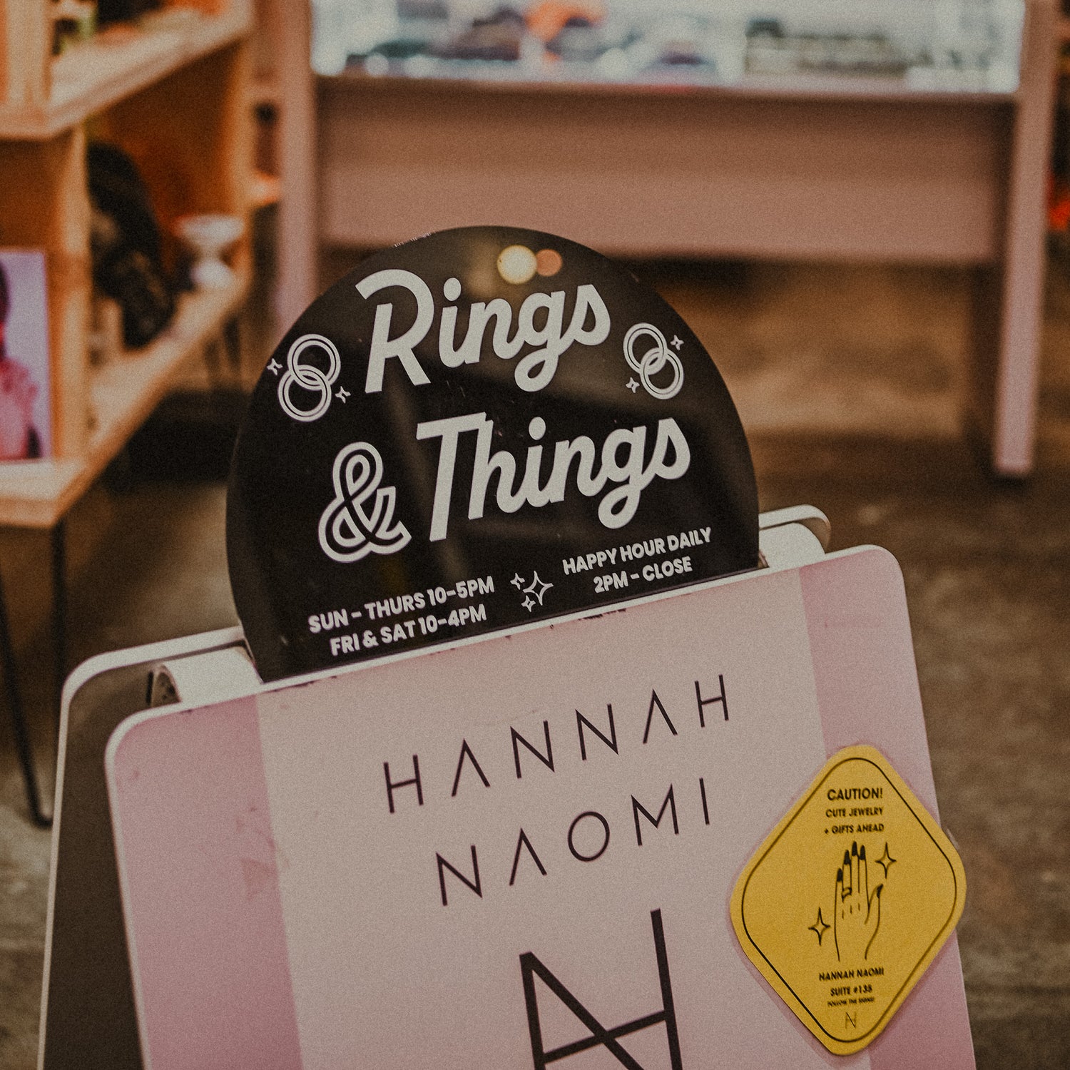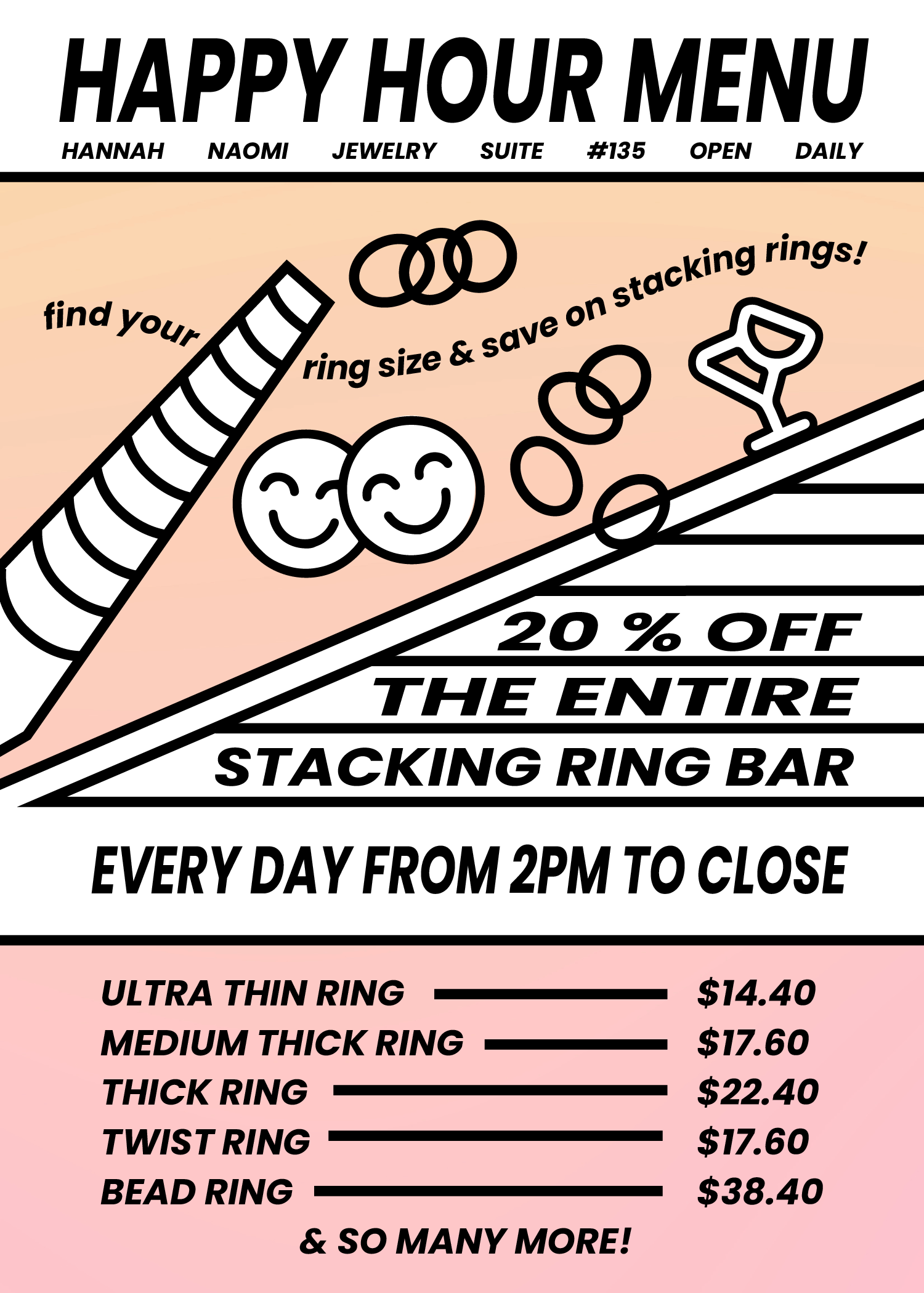 JOIN US FOR HAPPY HOUR FROM 2PM - CLOSE. That's 20% off all our rings at the Mix + Match Stacking Ring Bar!