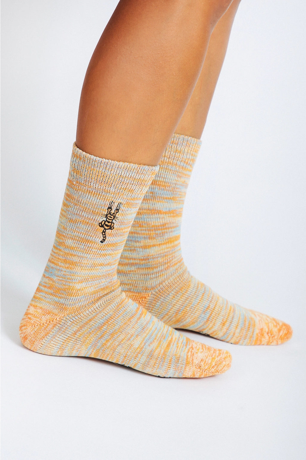 Embrace your inner cat lovin' self with a hanging cat embroidery on the leg. These mid-weight crews feature mixed yarn patterns, reinforced toe and heel and will comfort you on the daily.