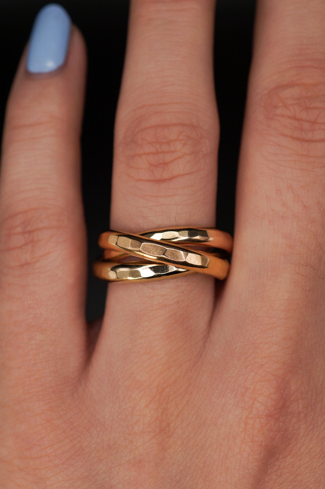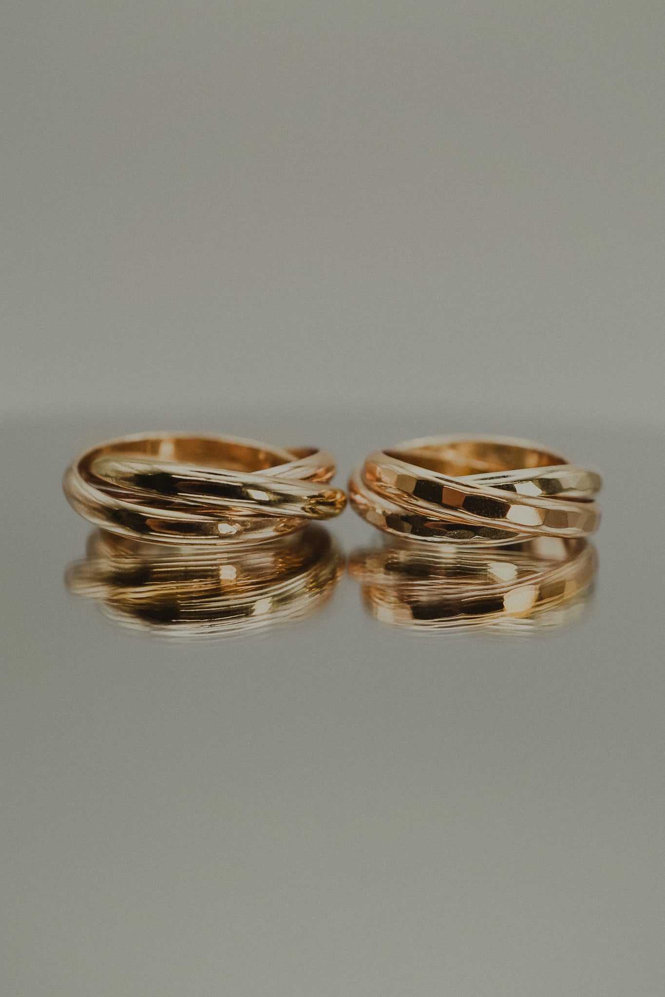 This listing is for one single Interlocking ring set made up of 3 INDIVIDUAL RINGS which are permanently entwined. Made with an 8 gauge half-rounded metal for easy rolling! Crafted with ethically sourced 14K Gold Fill. This metal is approximately 3.25mm thick. Choose from a Smooth or Hammered finish. *Because these rings overlap they are meant to have some movement. We suggest sizing up by a quarter or half size. |
