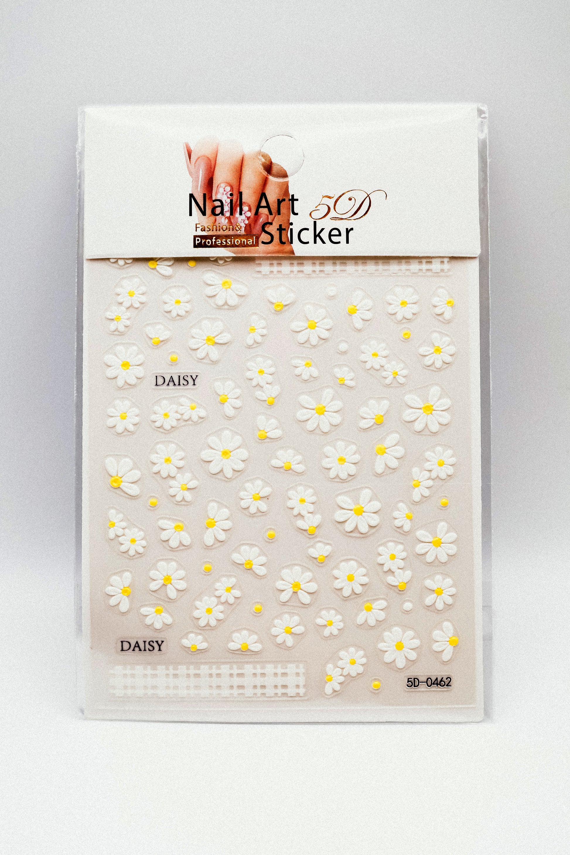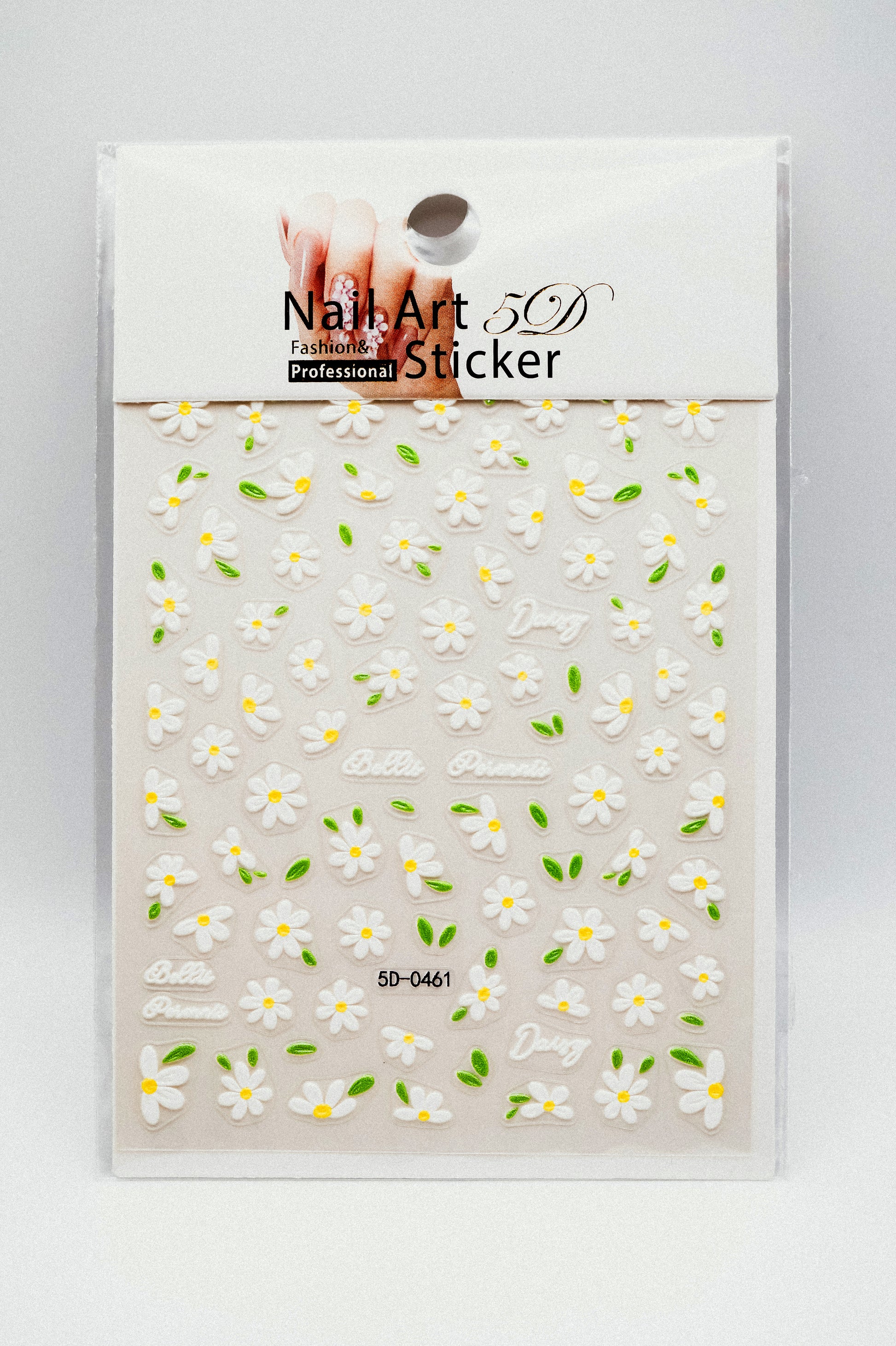 Bring playful charm to your nails with these Daisy Floral Nail Decals. Each 5"x3.25" sheet features delicate 3D white flowers in various patterns to mix and match. Just apply your favorite designs onto clean nails and finish with a clear top coat for a lasting, polished style. Each pack contains 1 sheet, with options ranging from classic white and yellow daisies to bright green-leafed blooms. Instantly brighten your manicure with these cute, tiny floral details!