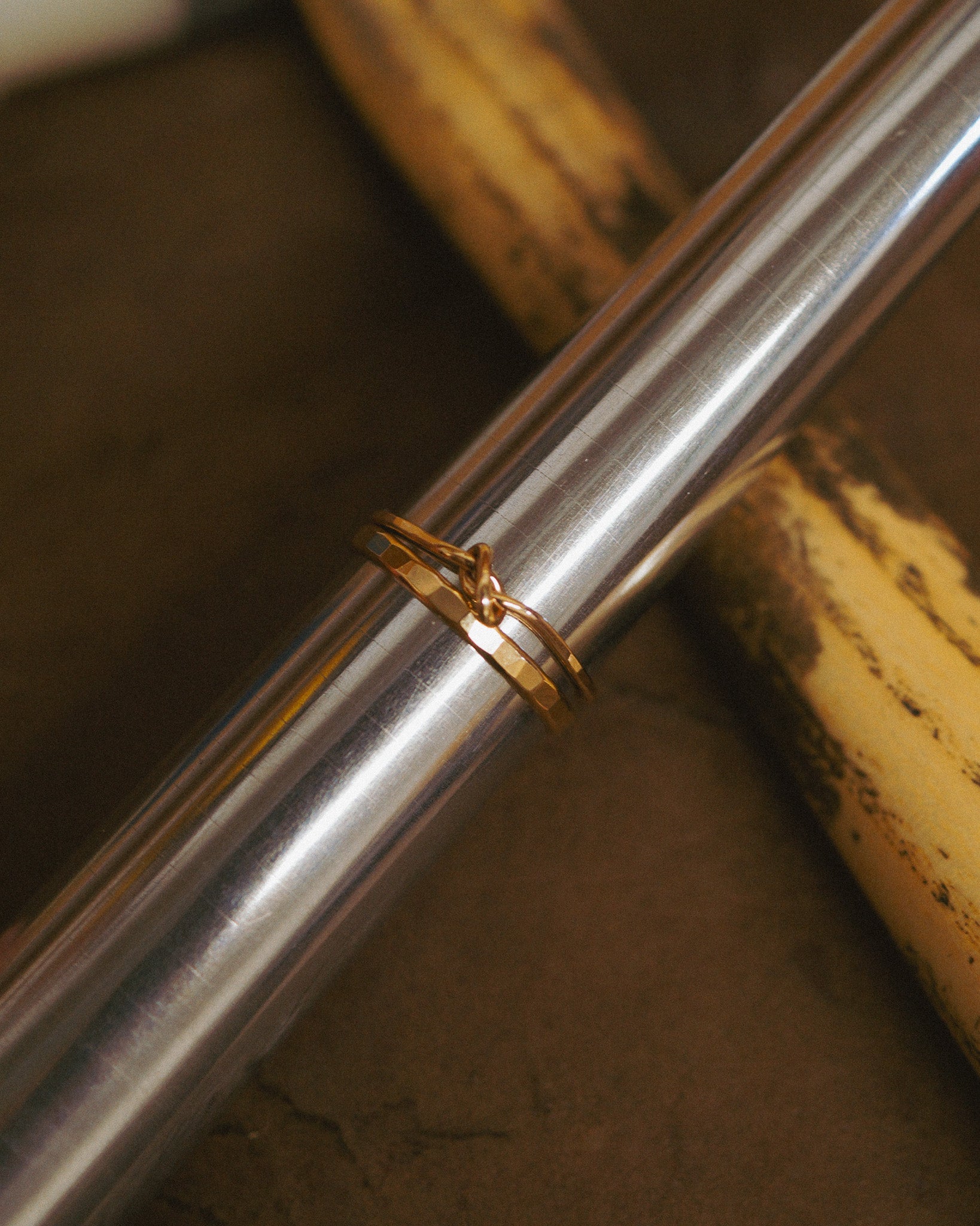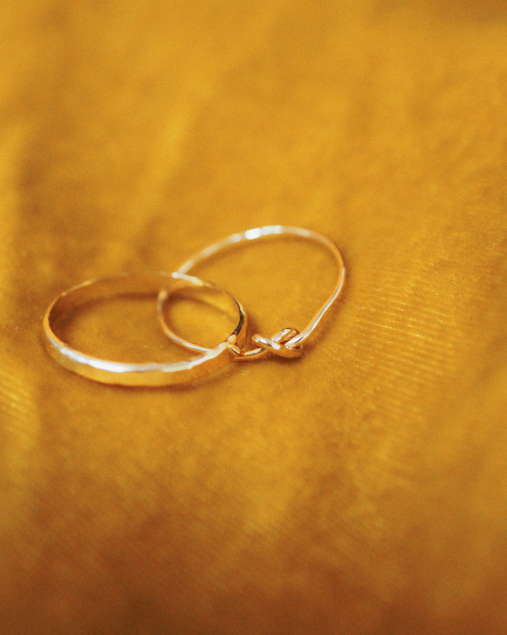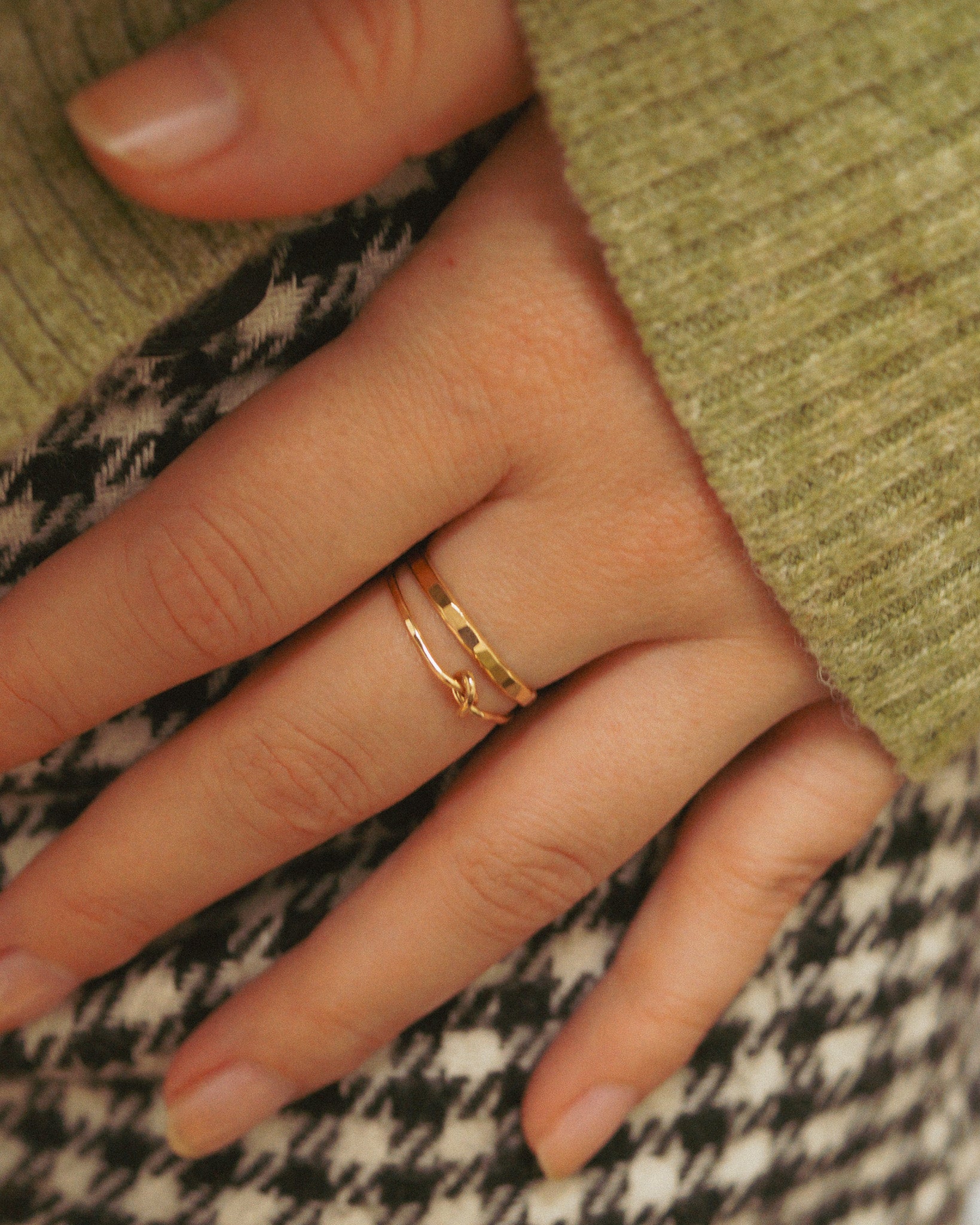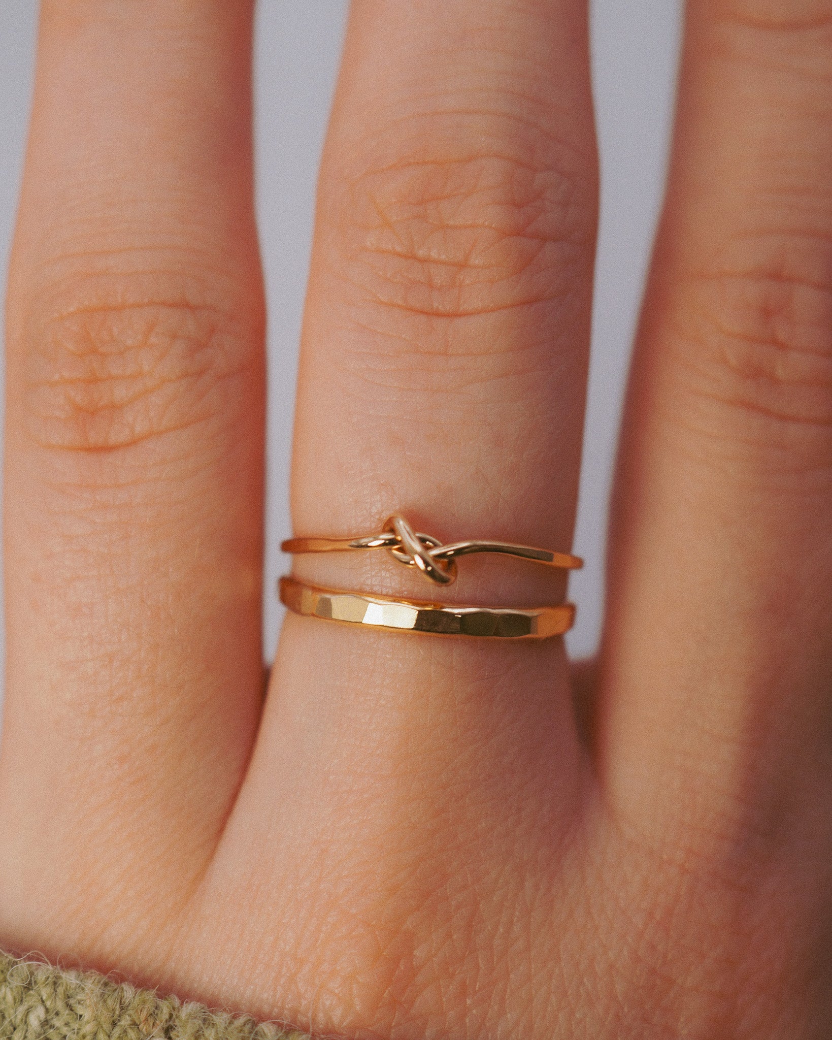 This set includes 2 rings: 1x THICK CLOSED KNOT RING (1mm thickness) 1x EXTRA THICK RING in a HAMMERED finish (2mm thickness) The total width of this set measures approximately 3mm. Want to mix sizes to wear on different fingers? No extra charge! Just leave your preferred sizes in the “order notes” box at checkout for a customized fit and effortless styling. |