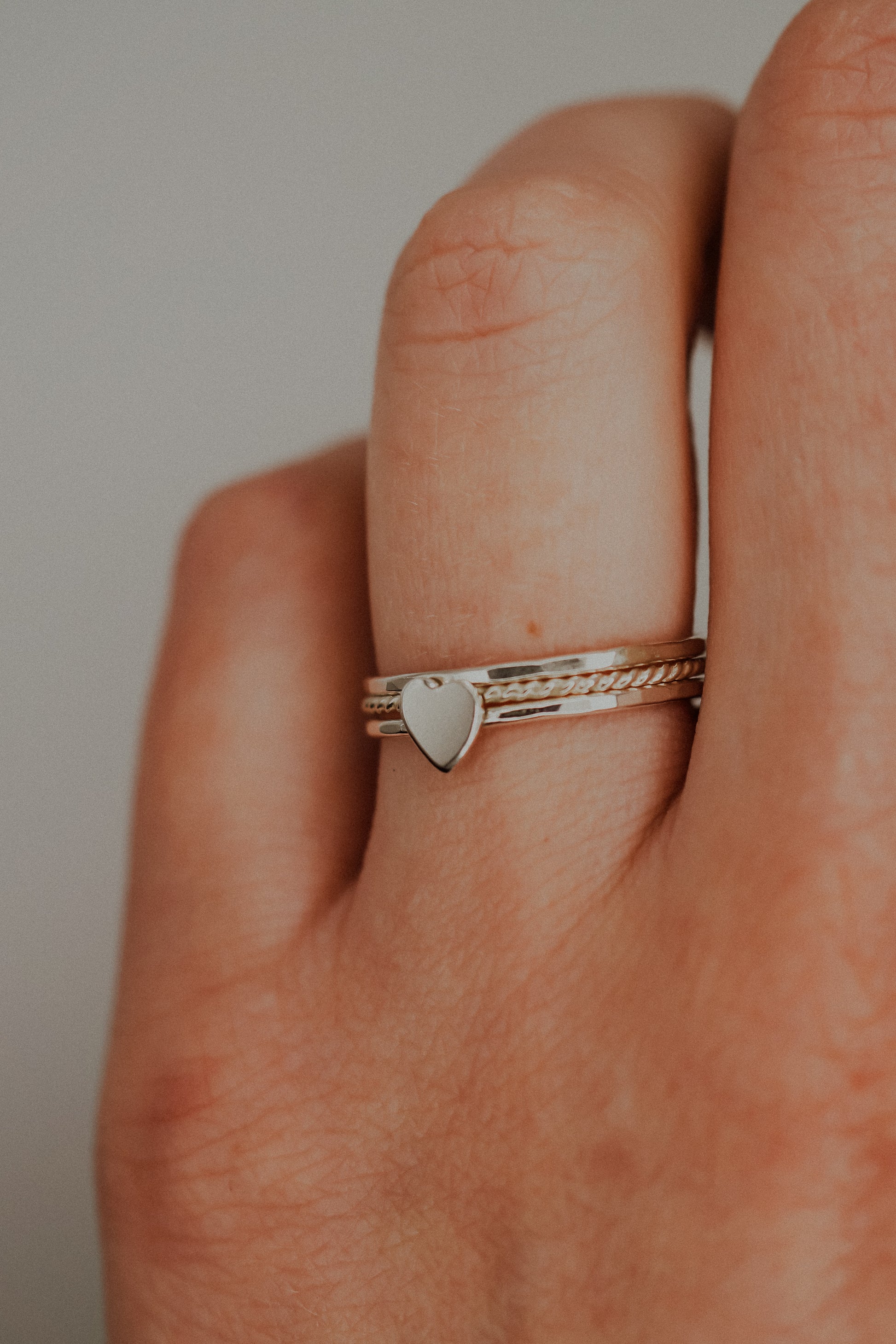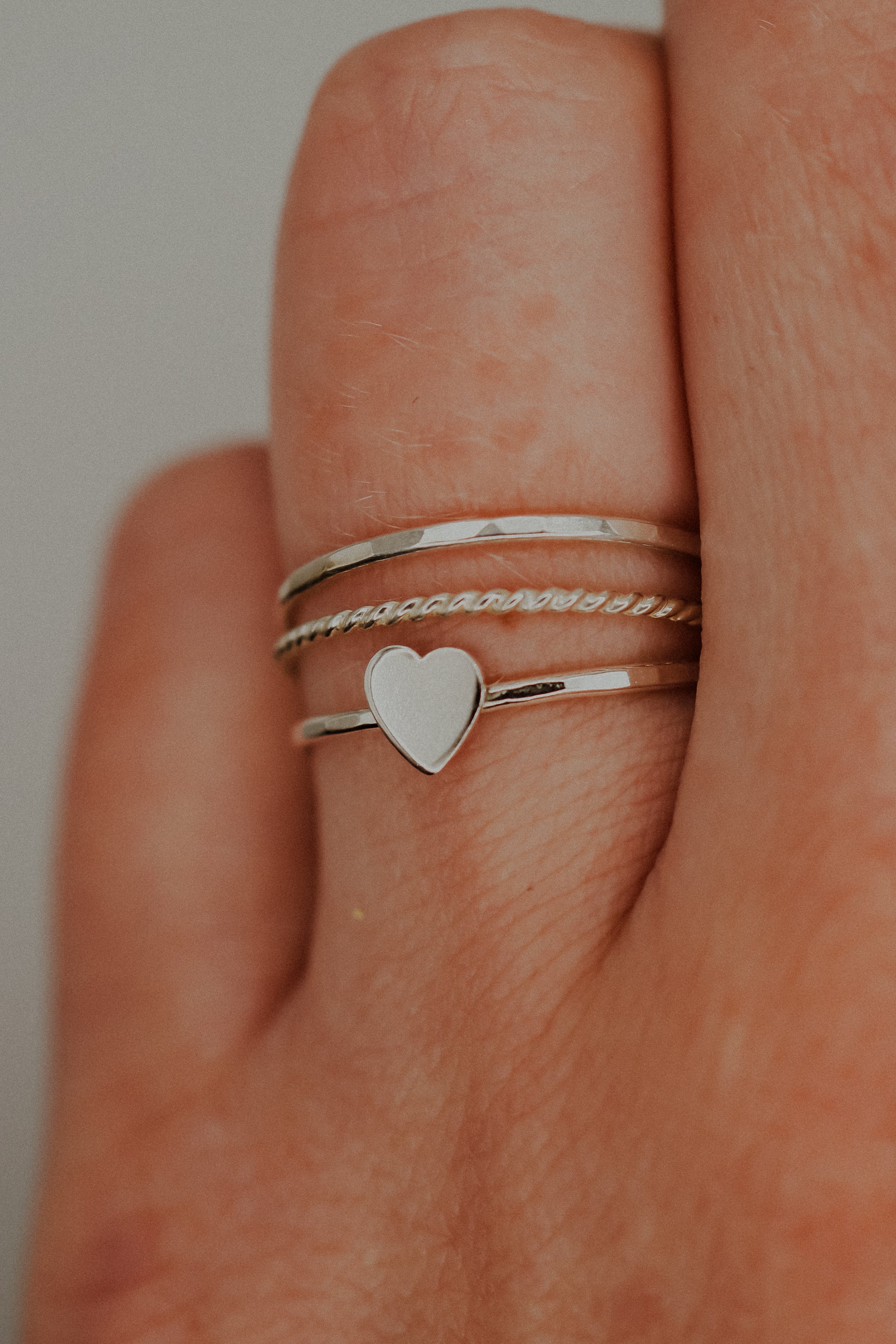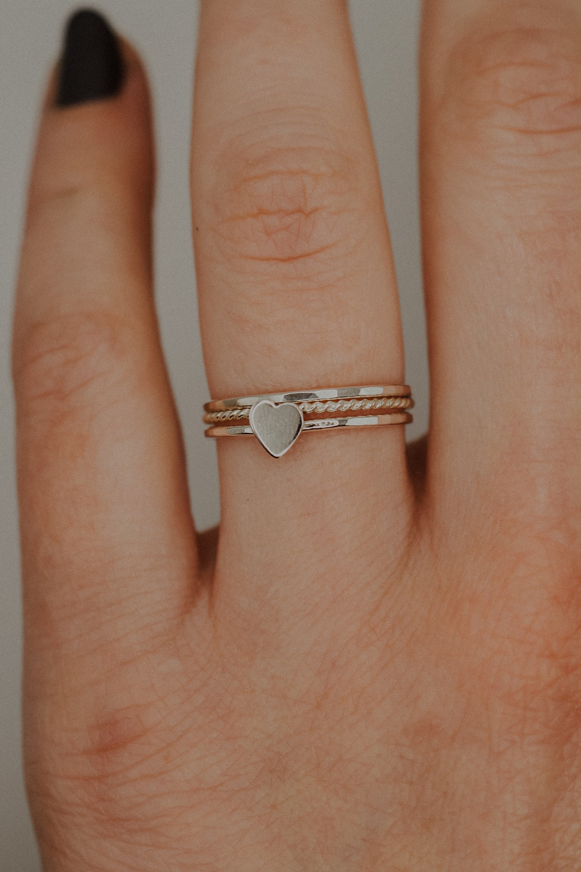The Heart Set of 3 Stacking Rings is a sweet and stylish trio that combines simplicity with charm. This set includes one classic Heart Ring, one delicate Twist Ring, and one Medium Thick Hammered Band—blending texture, shape, and sentiment into one easy-to-wear stack.