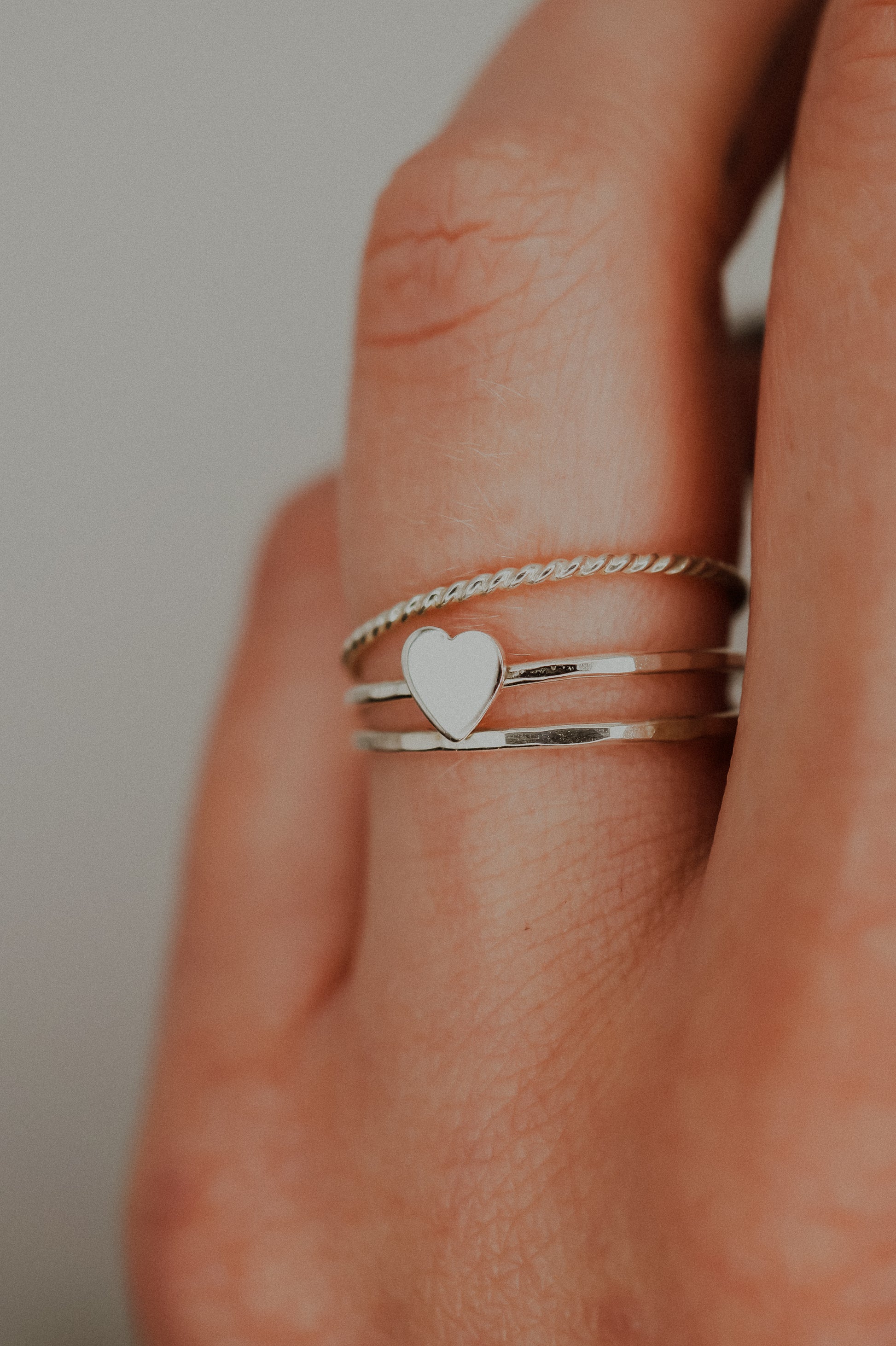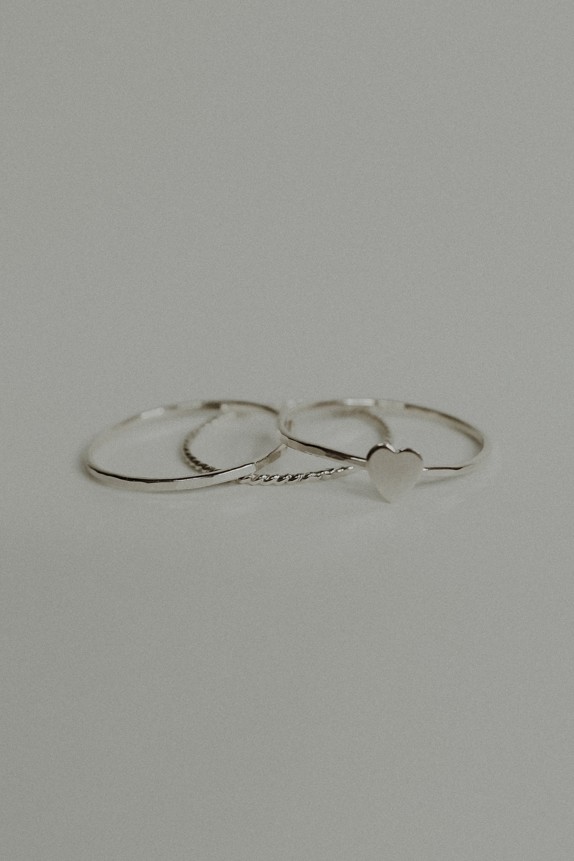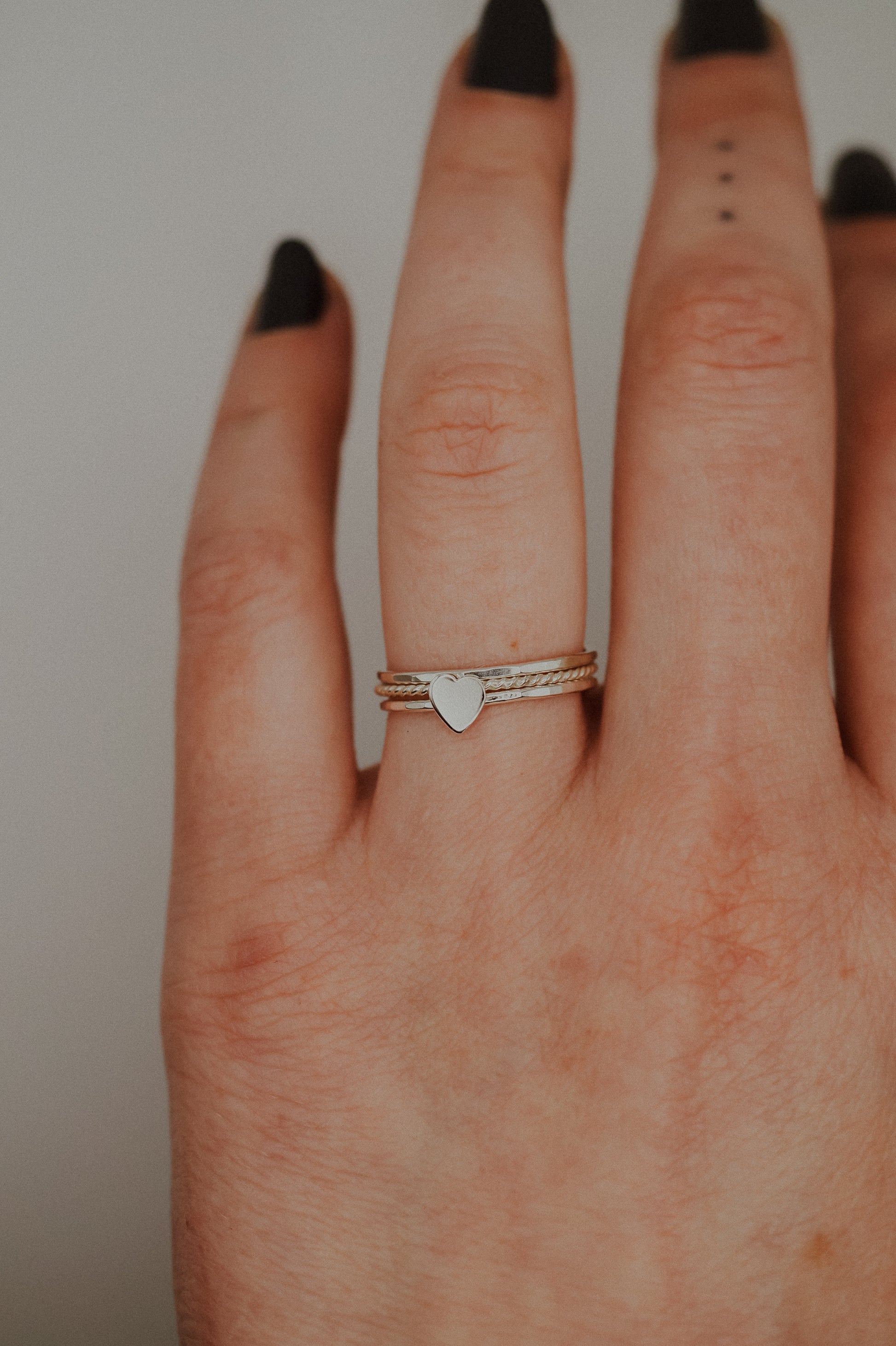 The Heart Set of 3 Stacking Rings is a sweet and stylish trio that combines simplicity with charm. This set includes one classic Heart Ring, one delicate Twist Ring, and one Medium Thick Hammered Band—blending texture, shape, and sentiment into one easy-to-wear stack.
