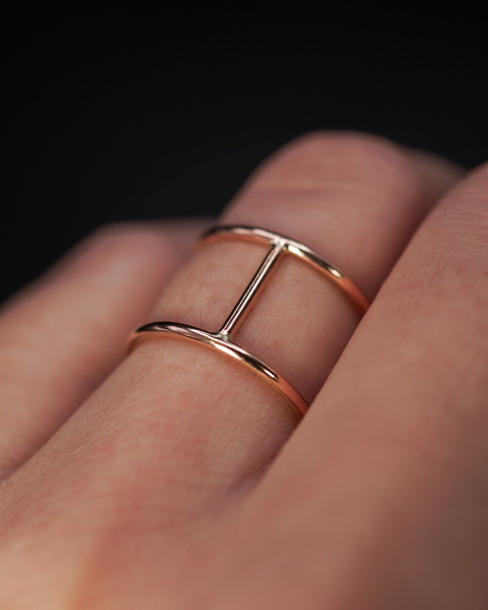 This is a gorgeous, trend-setting ring made of thick, durable metal. Two stacking rings are held in place by evenly spaced bars. This ring is perfect from all angles and is a great fit for men or women! This ring is incredibly lightweight and yet still very noticeable — it makes a perfect ‘daily wear’ ring and is quickly becoming one of our most popular Unisex styles!