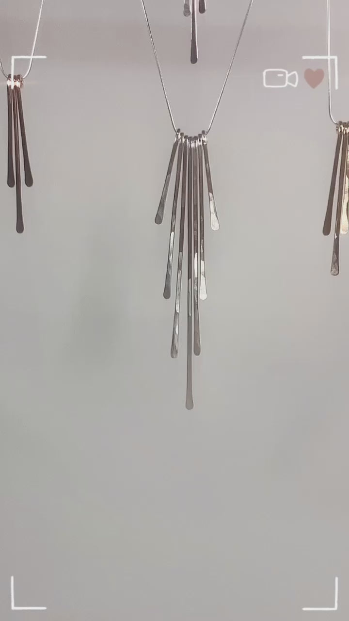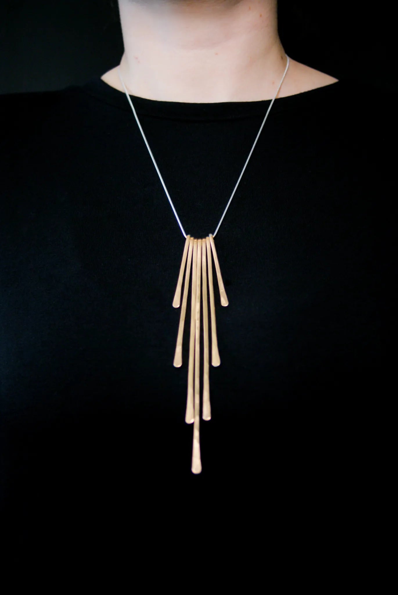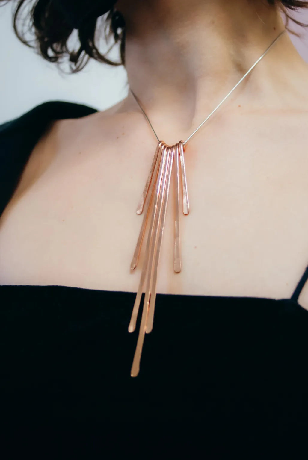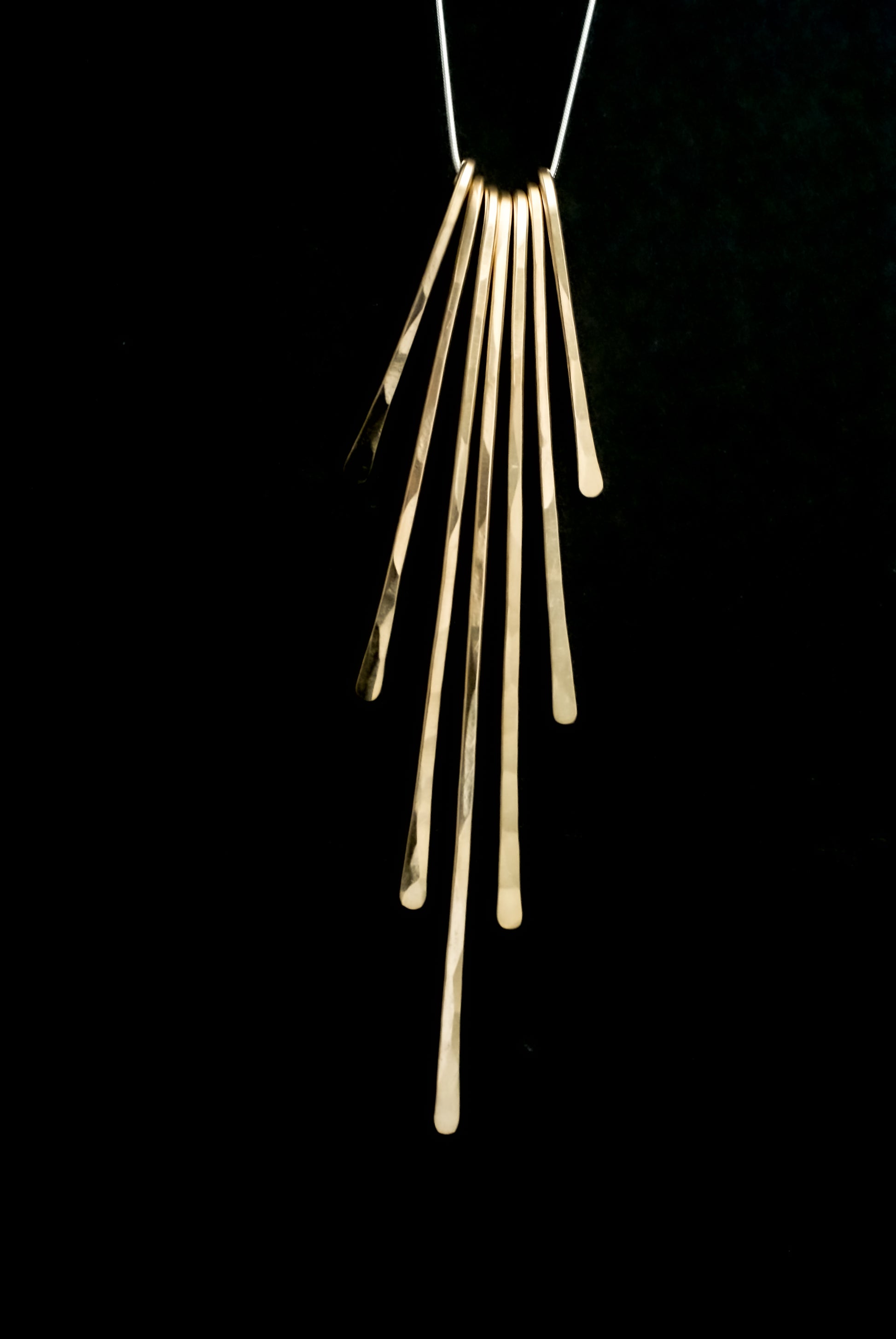 This gorgeous necklace is a show-stopper! The design is simple but the effect is dramatic. The Sunburst Necklace is the original addition to the Sunburst Collection. To make this design, we hammer seven individual strips of thick metal into their unique shapes and string them together to create one eye-catching piece.