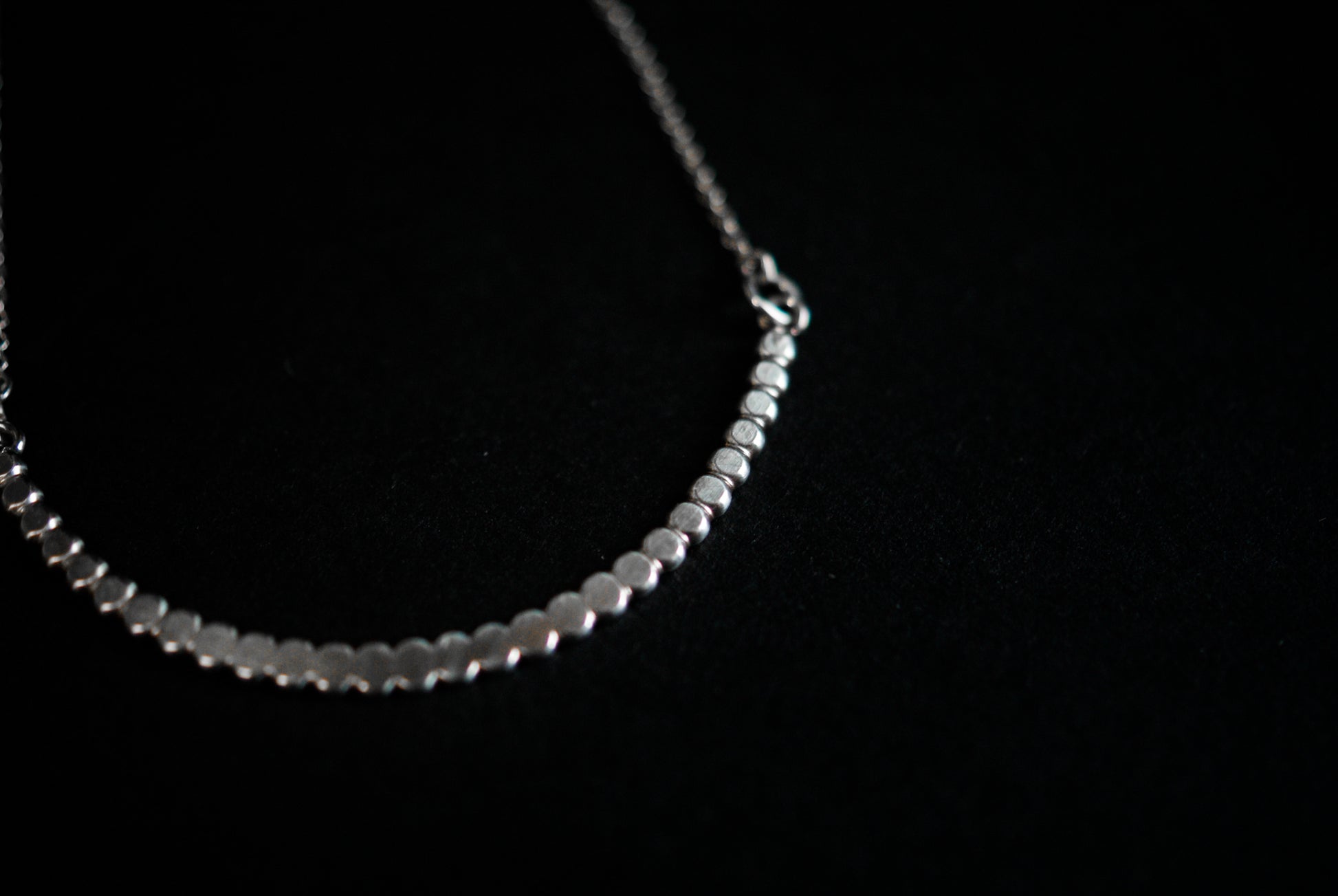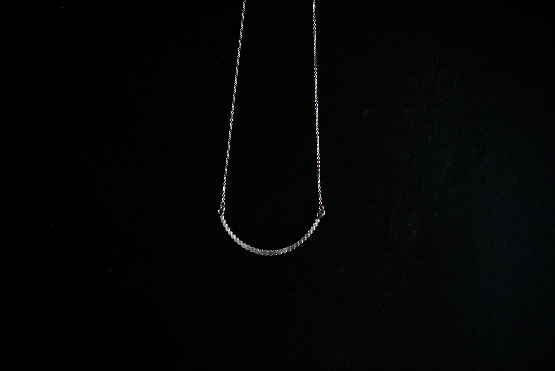 This beautiful necklace is a simple and elegant addition to our beaded line. We’ve hammered bead wire into a small, slightly curved shape. The curved bead pendant measures approx. 1.75″ in size. The necklace hangs from a delicate 14K gold-filled, 14K rose gold filled, or sterling silver chain with a lobster clasp.