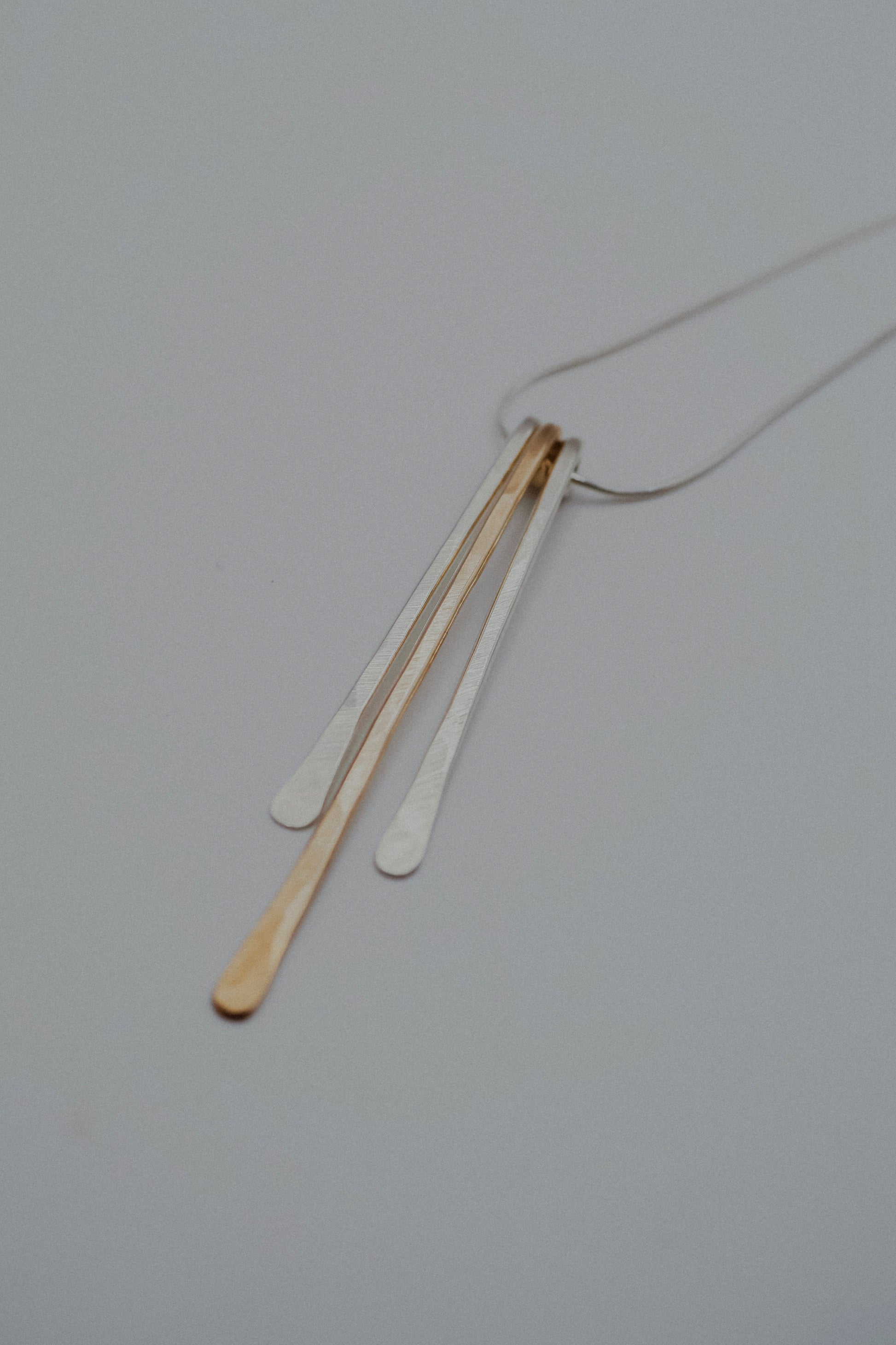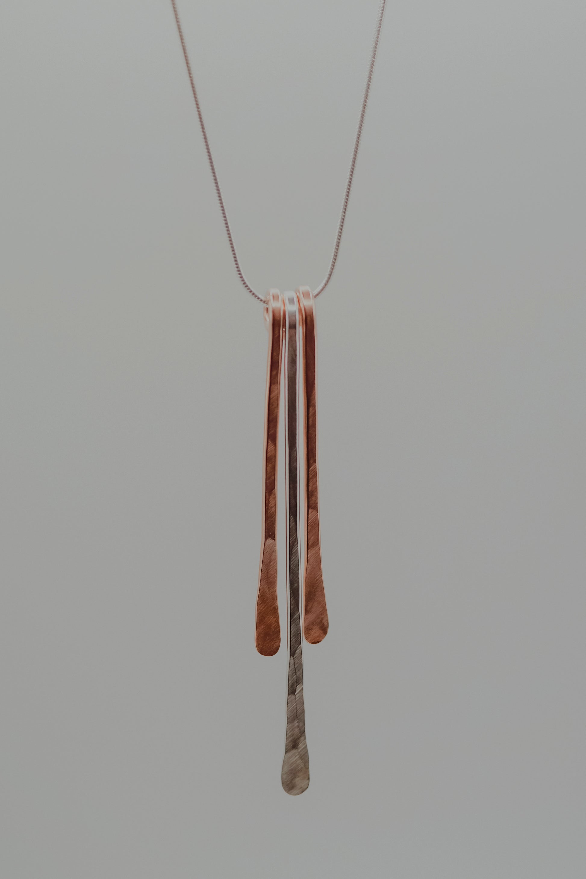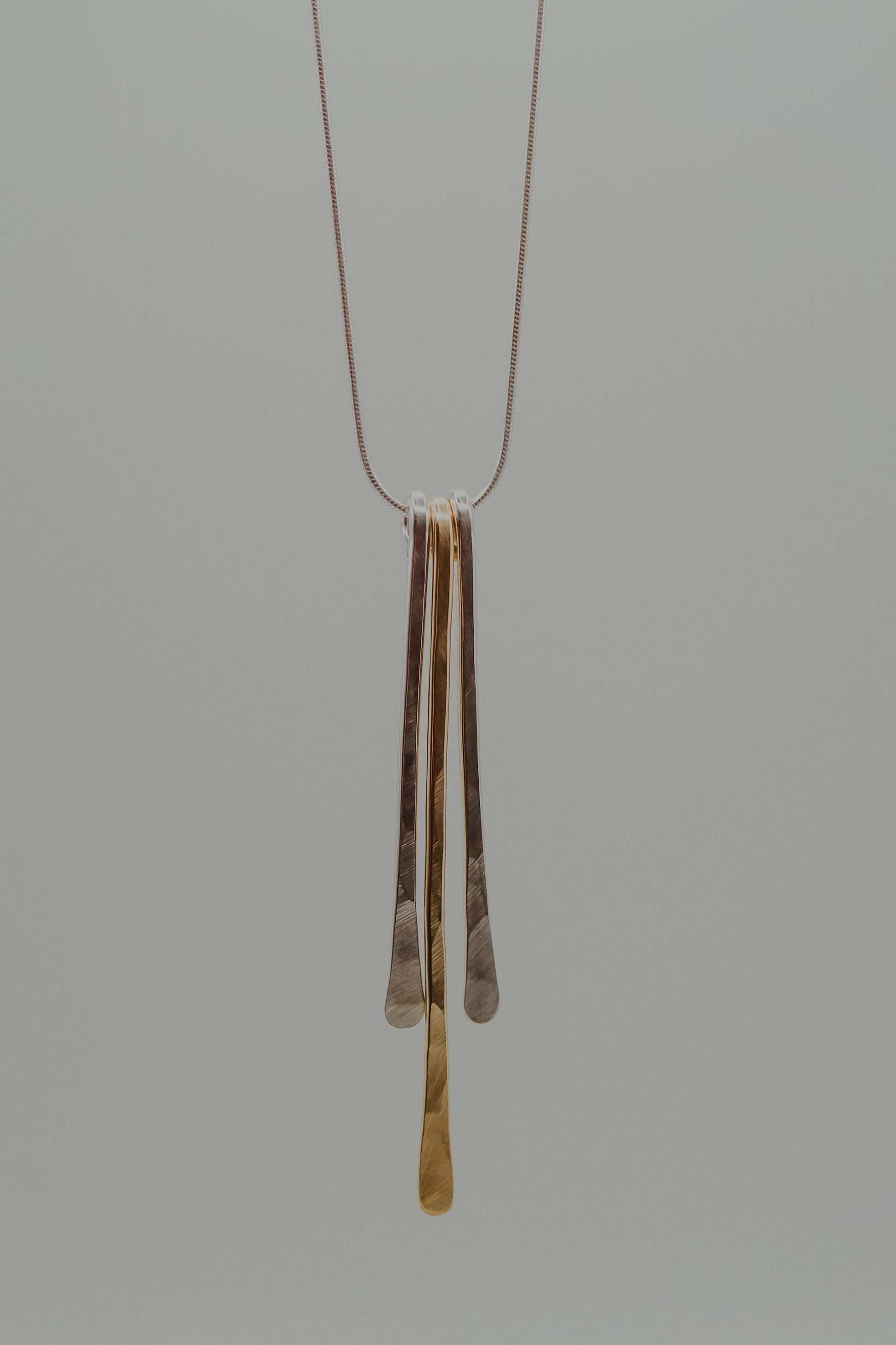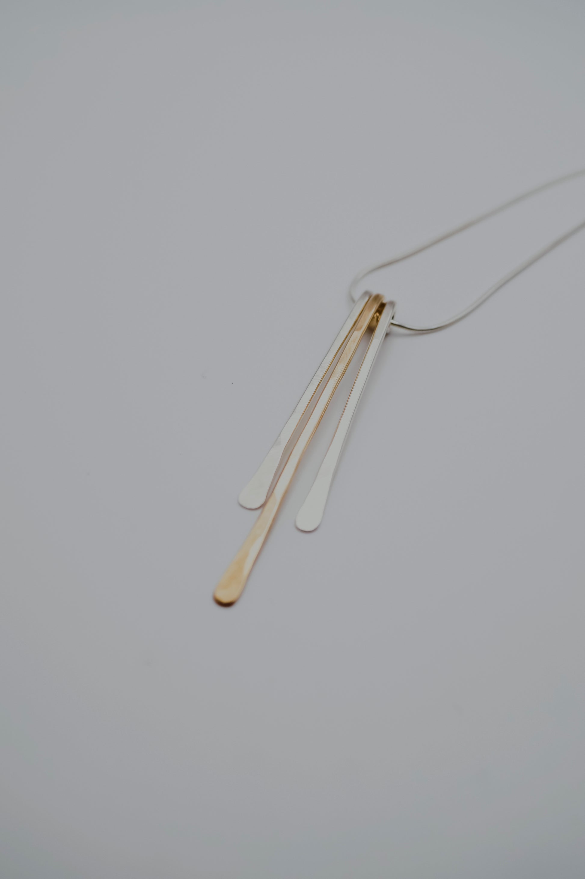 The design is simple but the effect is dramatic. We hammer three individual strips of thick, gold filled, rose gold filled, or sterling silver metal into a unique pendant design.