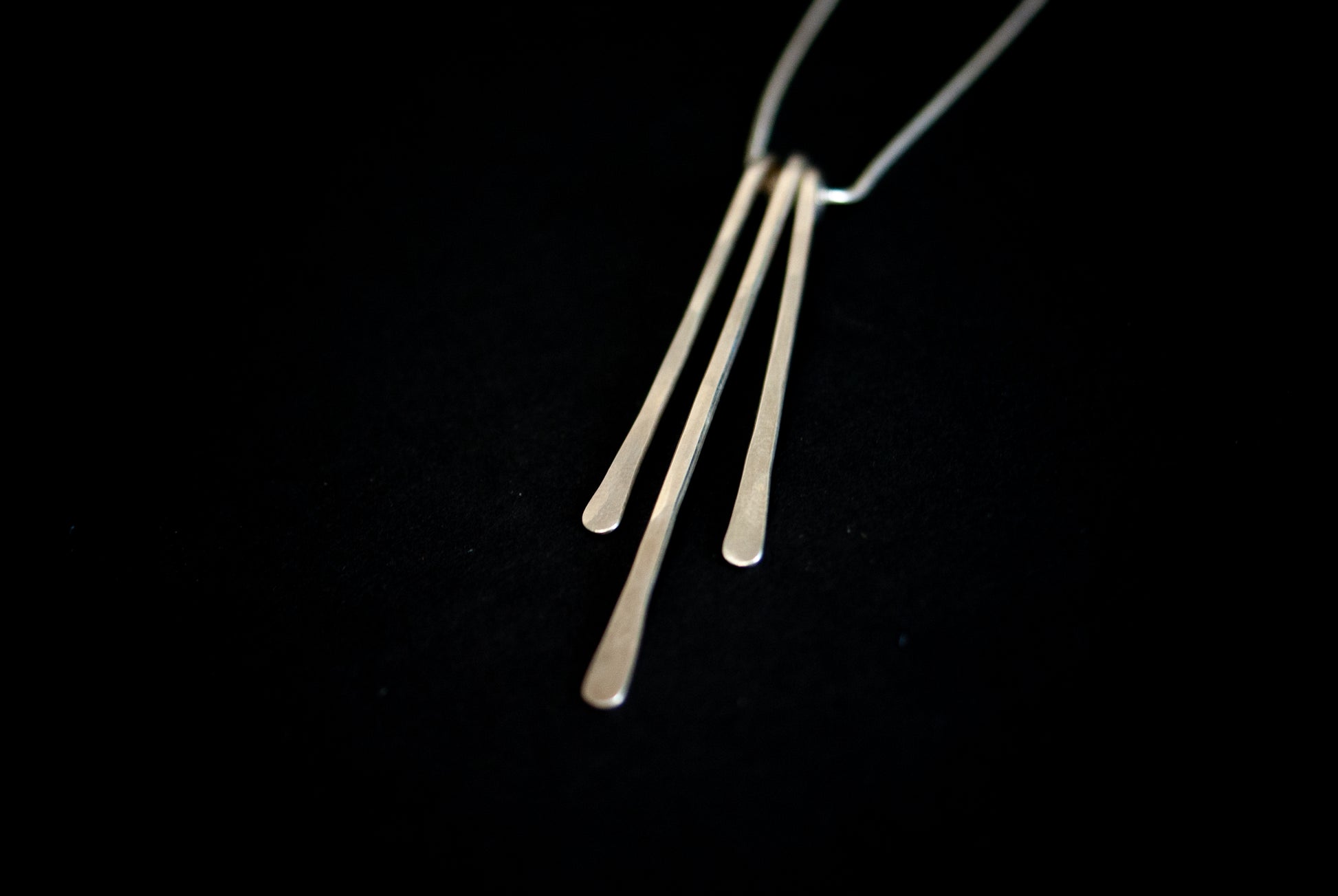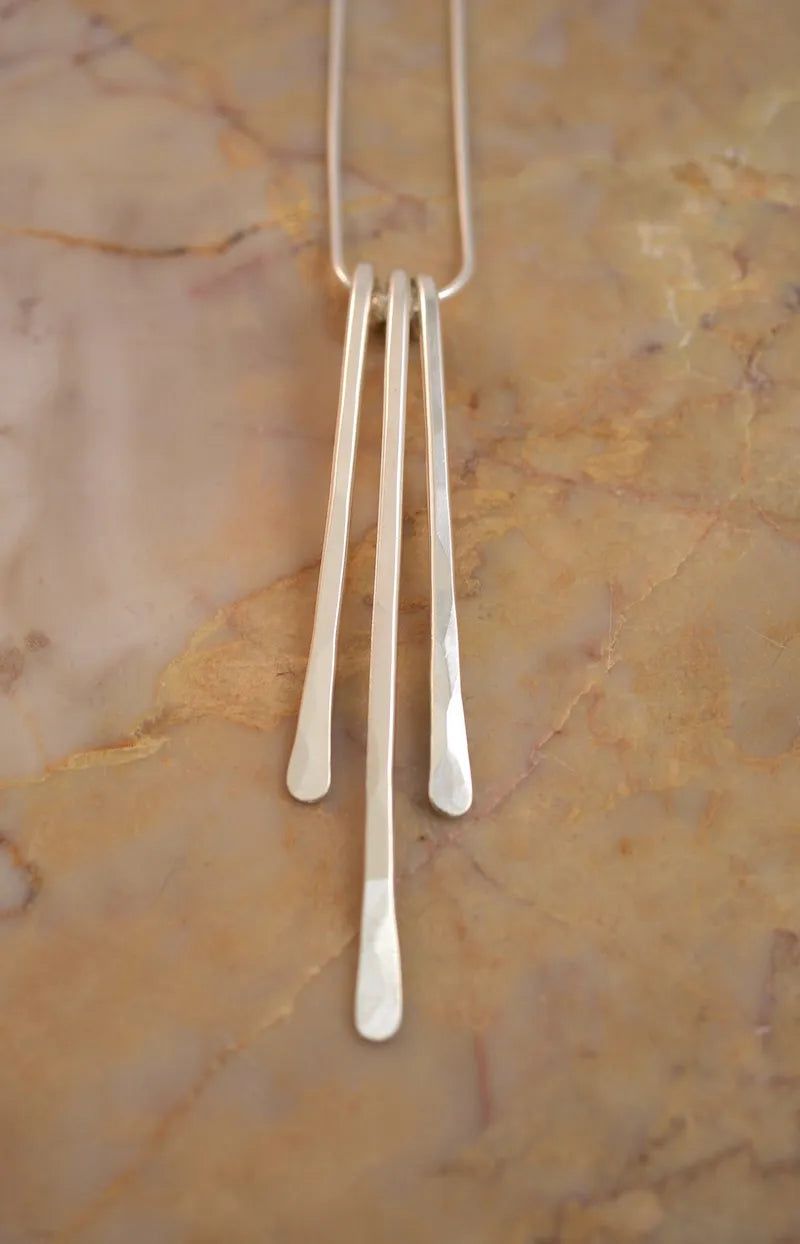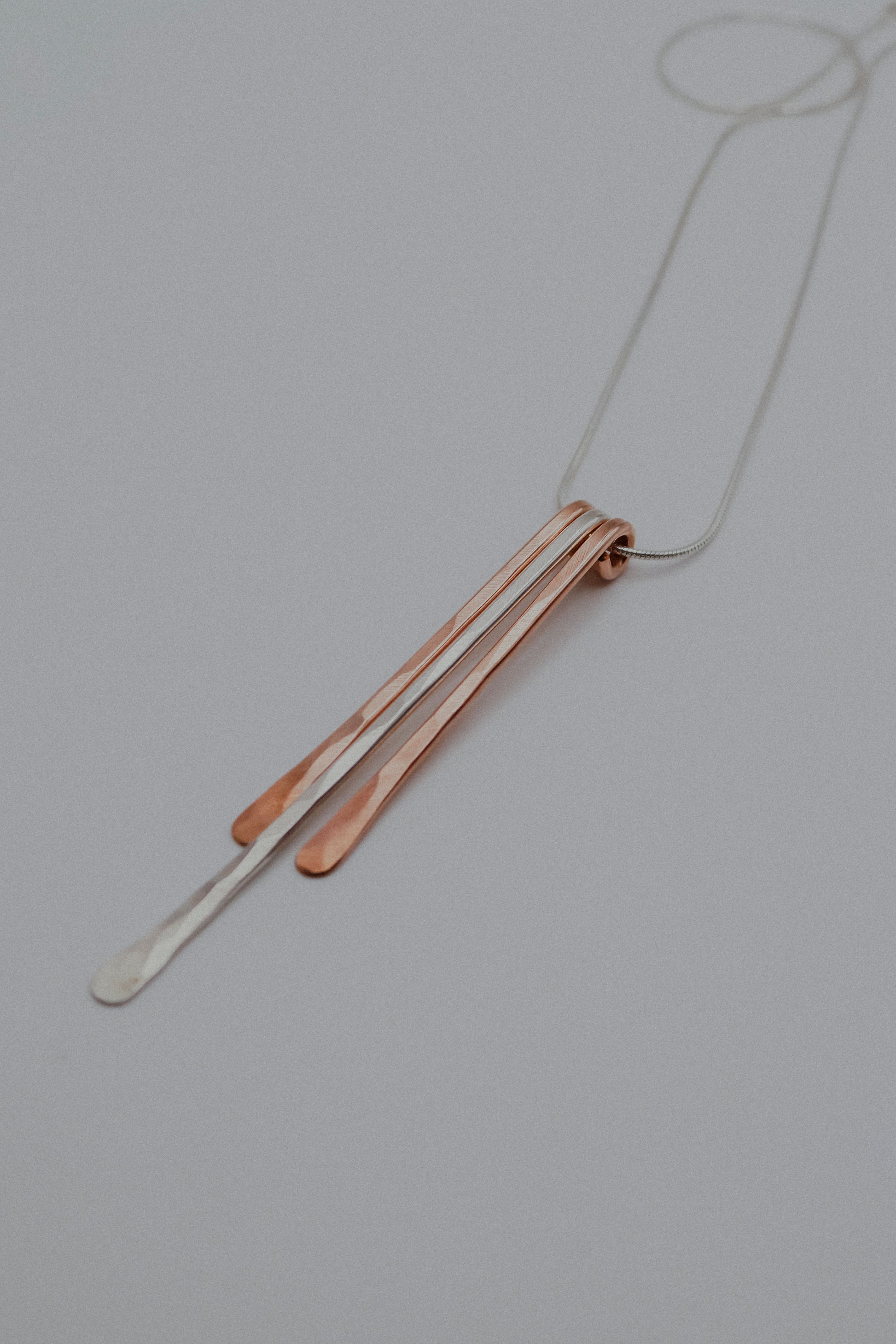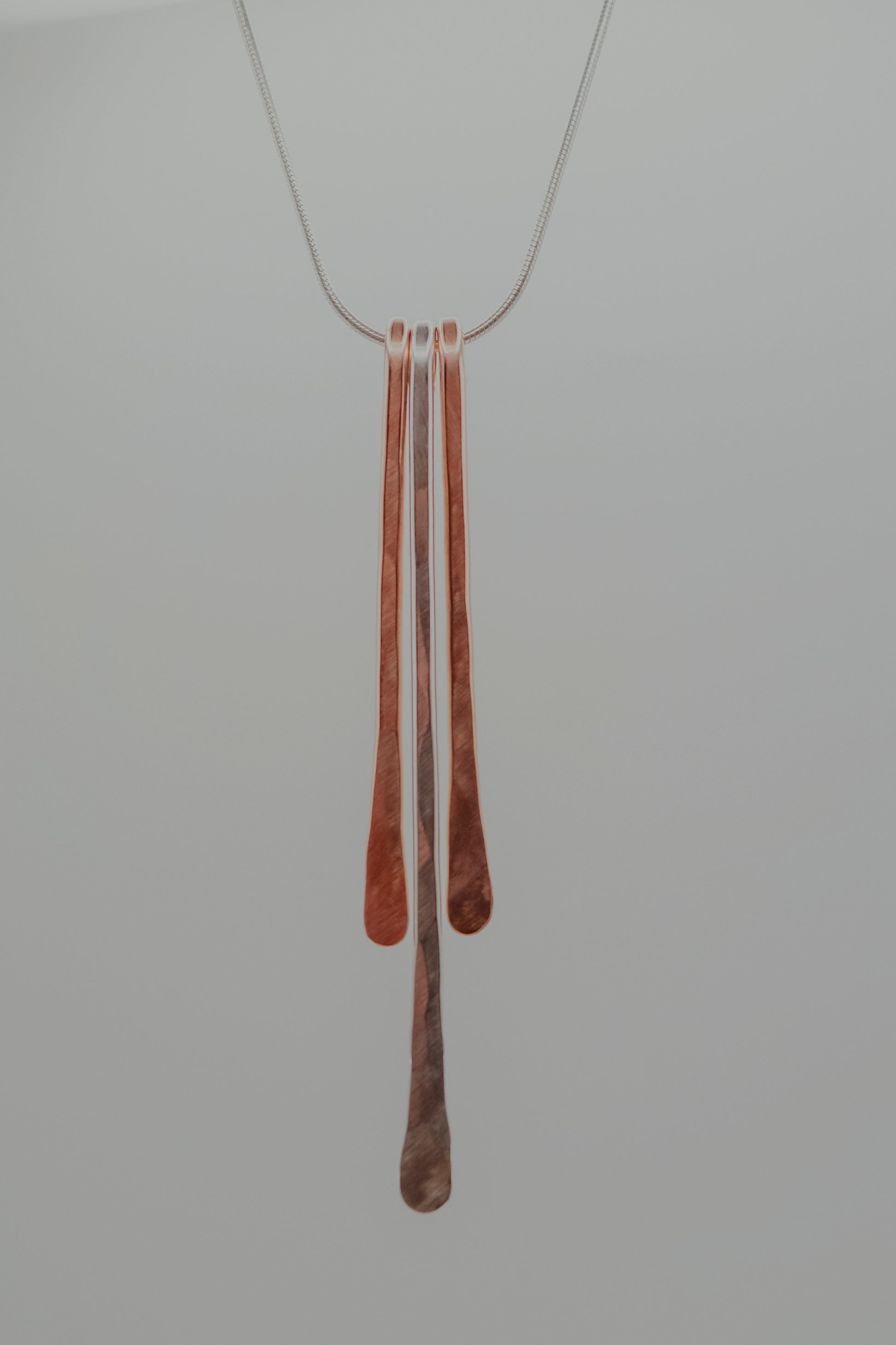 The design is simple but the effect is dramatic. We hammer three individual strips of thick, gold filled, rose gold filled, or sterling silver metal into a unique pendant design.