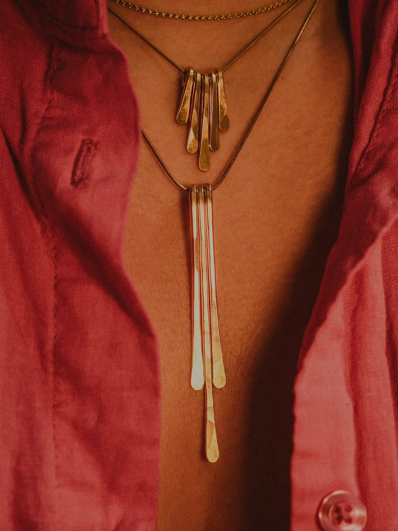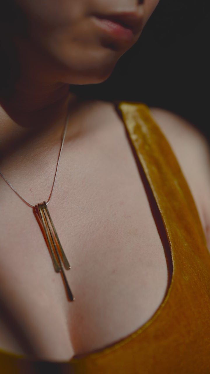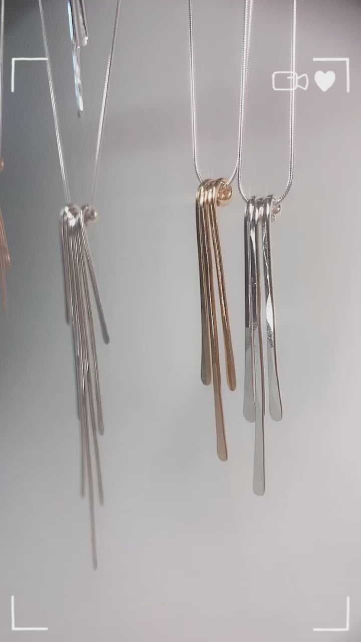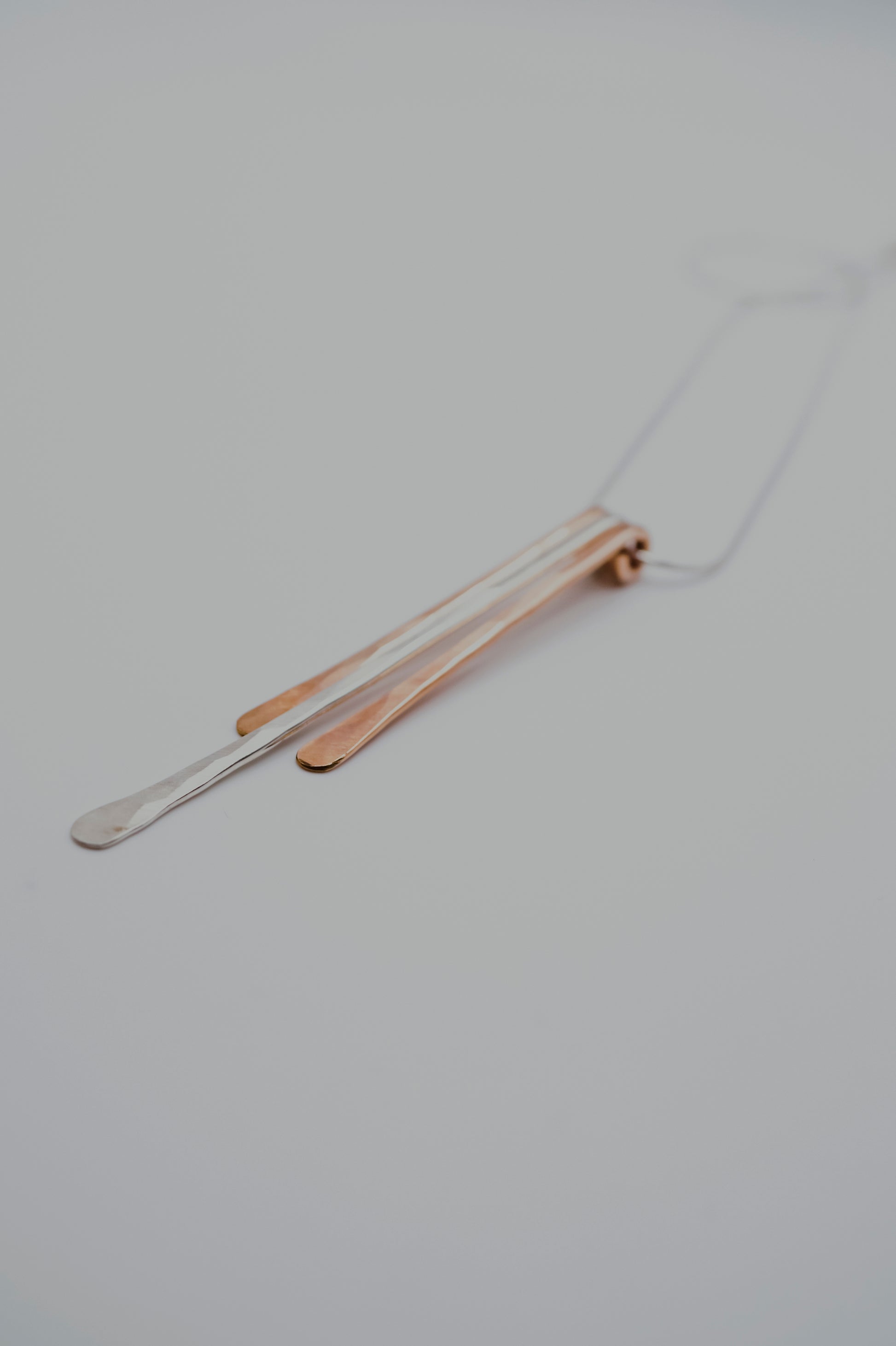 The design is simple but the effect is dramatic. We hammer three individual strips of thick, gold filled, rose gold filled, or sterling silver metal into a unique pendant design.