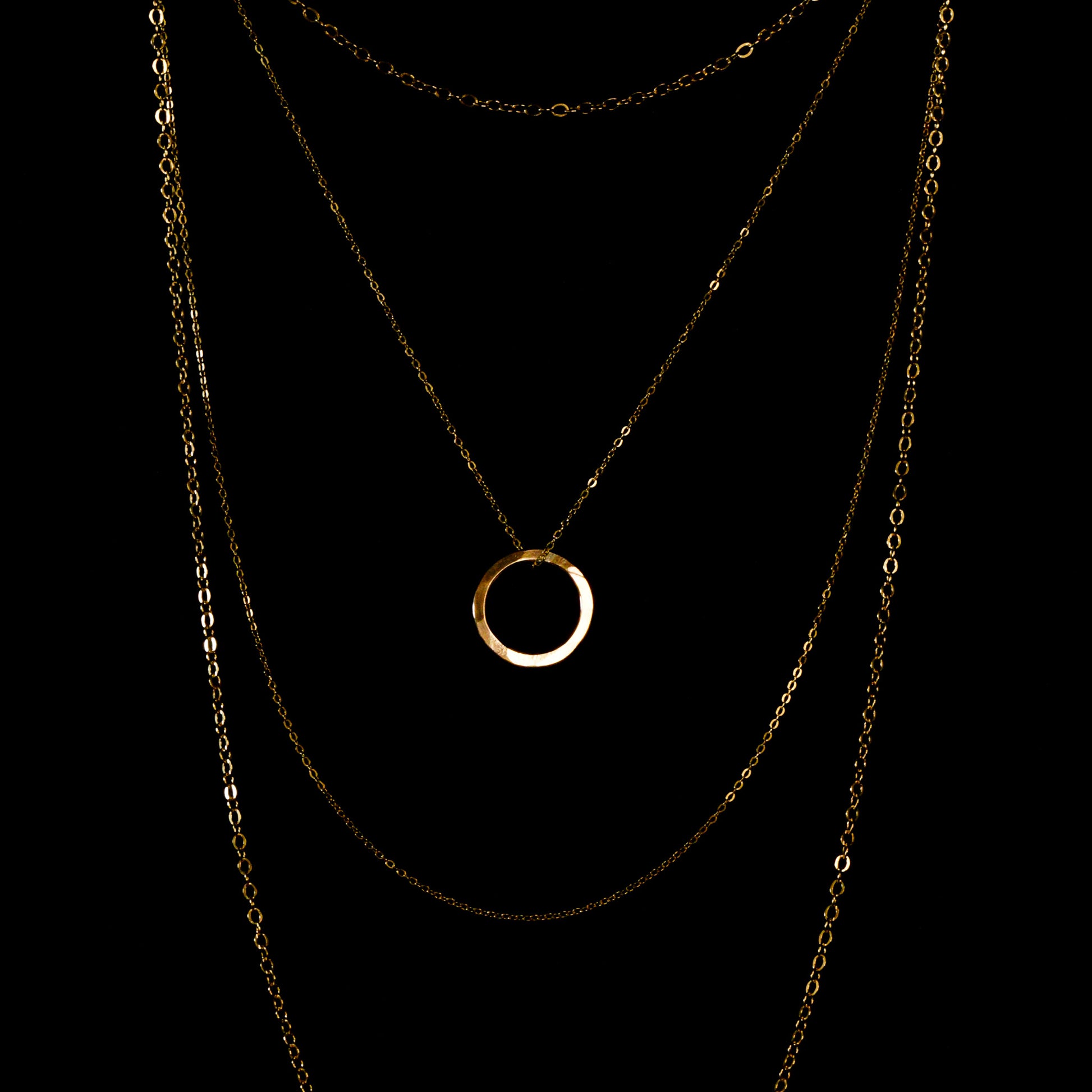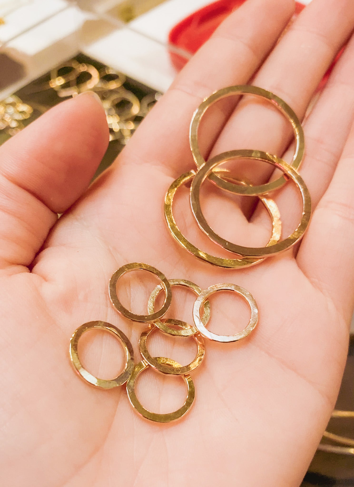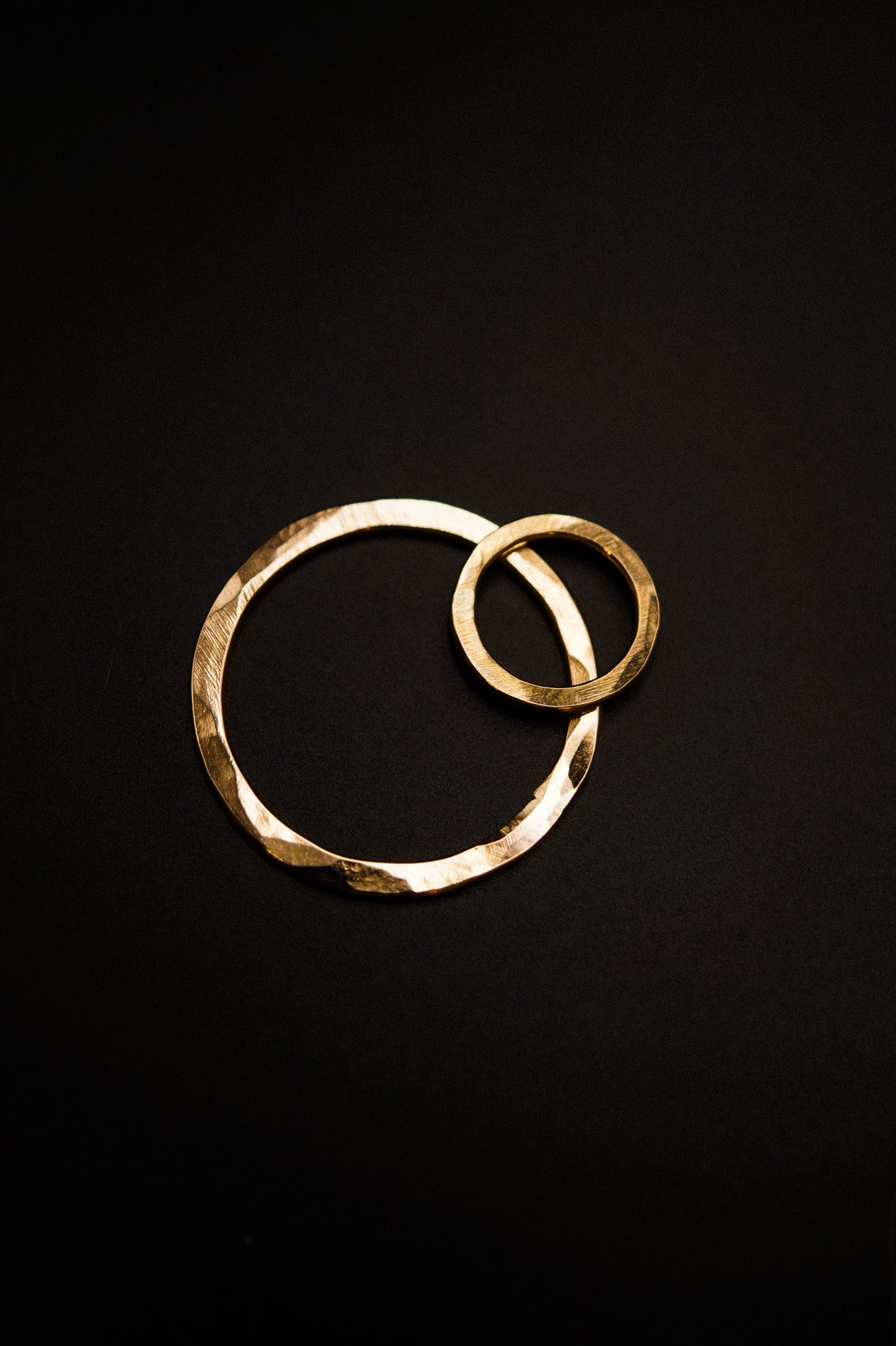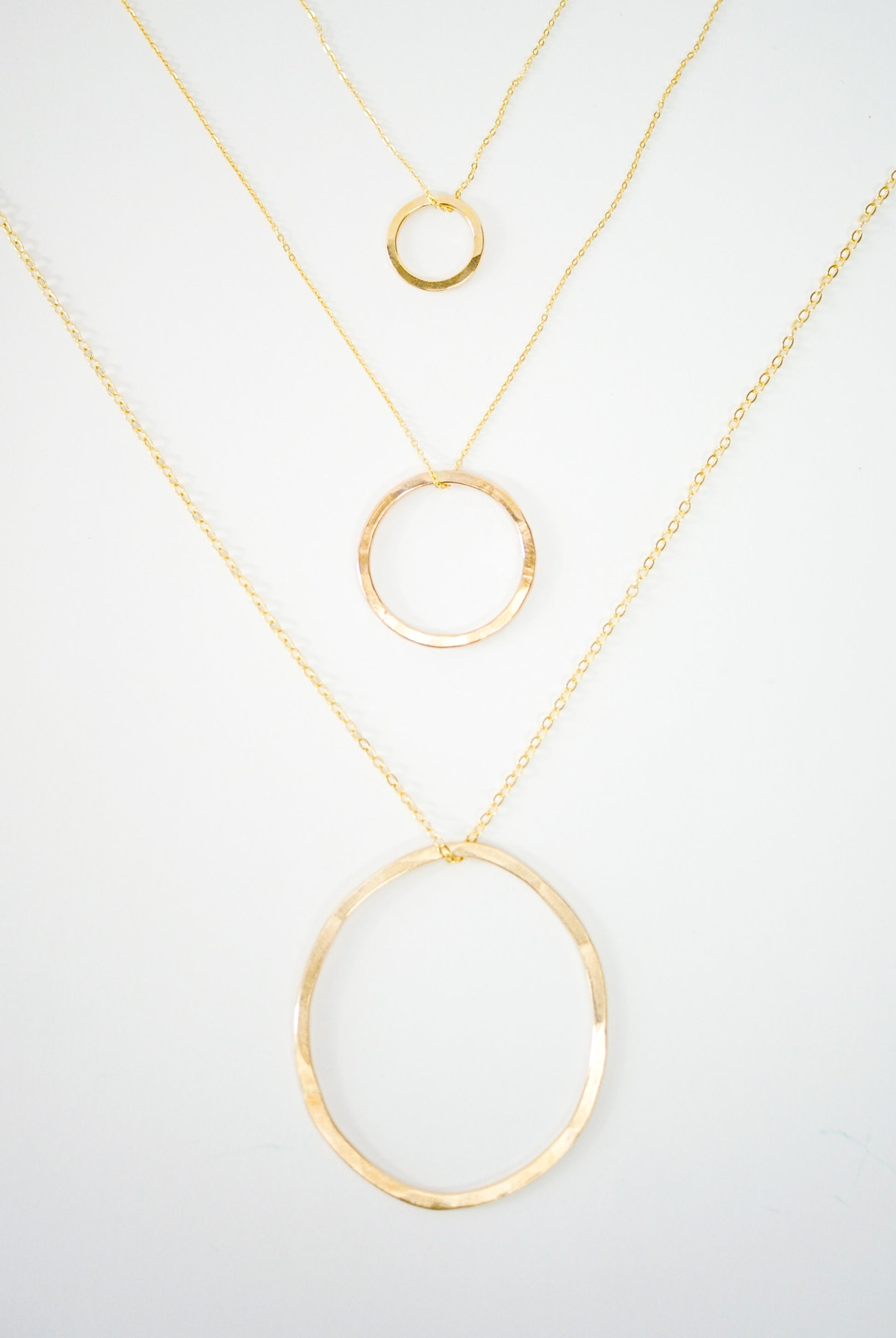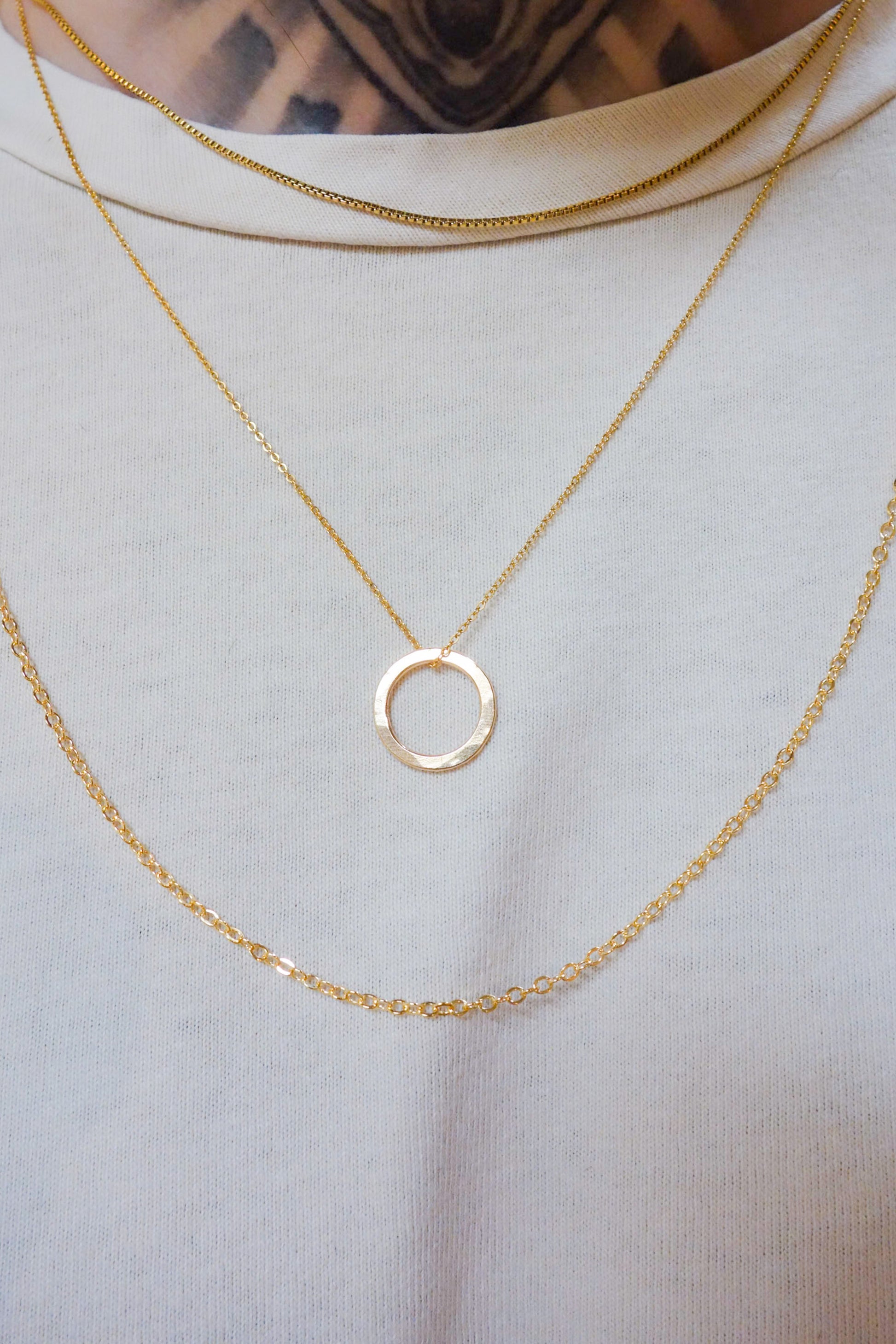 To make this pendant we hand-form and solder a thick ring of metal into an organic circle shape. Then we hammer out the metal to flatten the pendant and add width and sparkle. Finally, we polish it to a shiny, reflective finish for to to add onto the chain of your choice. Because each piece is made by hand, every pendant will have a slightly organic shape which makes each necklace unique.
