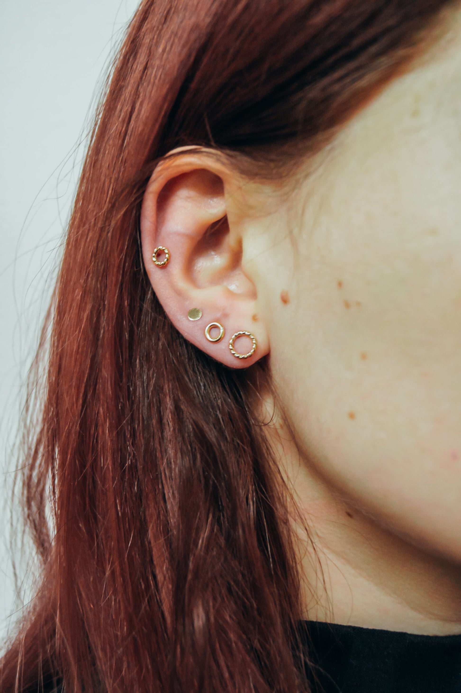 Each Open Circle stud earring is individually shaped by hand for a beautiful hand-crafted, high-quality earring. First, we solder a small circle to an ear wire post. Then we polish each earring to a bright, shiny finish!
