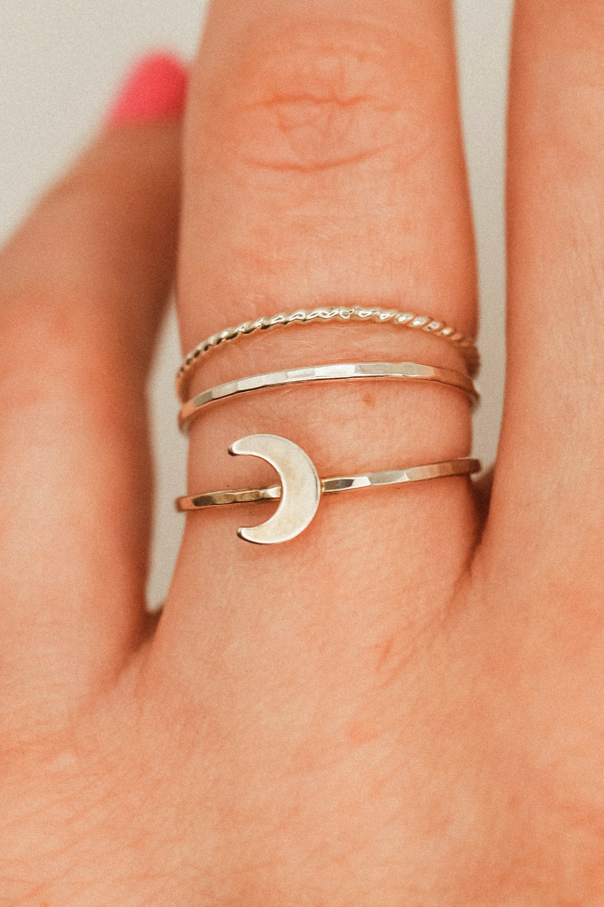 The Moon Set of 3 Stacking Rings is a playful, celestial-inspired trio that adds just the right amount of sparkle to your everyday look. This set includes Moon Ring, one delicate Twist Ring, and one Medium Thick Hammered Band—offering a mix of shine, texture, and charm.