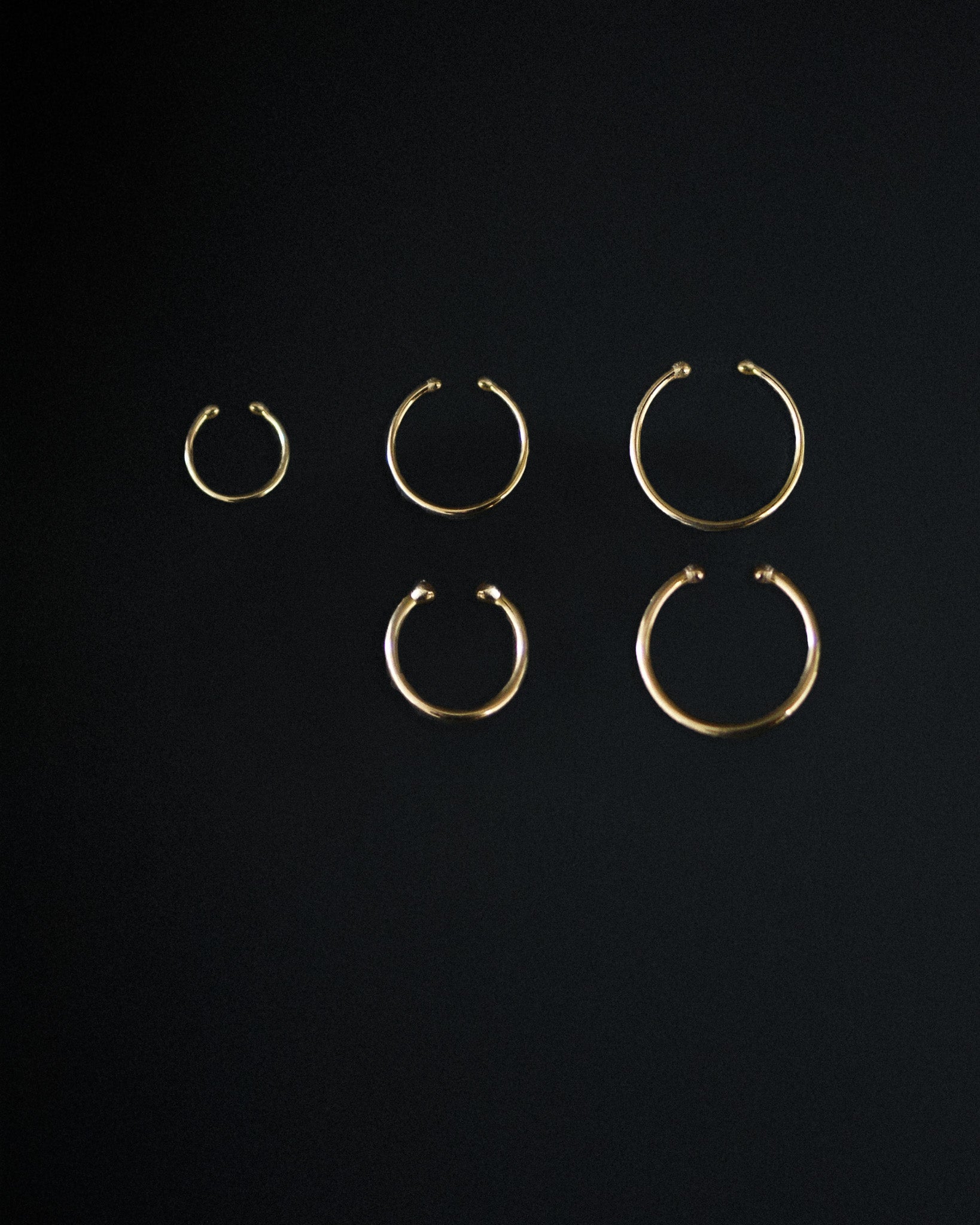 This listing is for a SINGLE Huggie Cuff for your nose or ear! Each cuff is made of SOLID 14K Gold or 14K Rose Gold or White Gold Extra Small | 6mm | Only available in the Thin metal style. Perfect for a faux helix look! Small | 7.5mm | Our most popular size. These are great for earlobes, cartilage, nostril, septum and more. Medium | 10mm | Another very popular size, the 10mm huggies are perfect for larger faux nose rings, tragus and conch jewelry. THIN style: made with 20ga, 0.7mm wire. THICK style: made with 18ga, 1mm wire. Each Huggie Cuff comes with 2x comfort dots to make your cuff extra comfortable! |