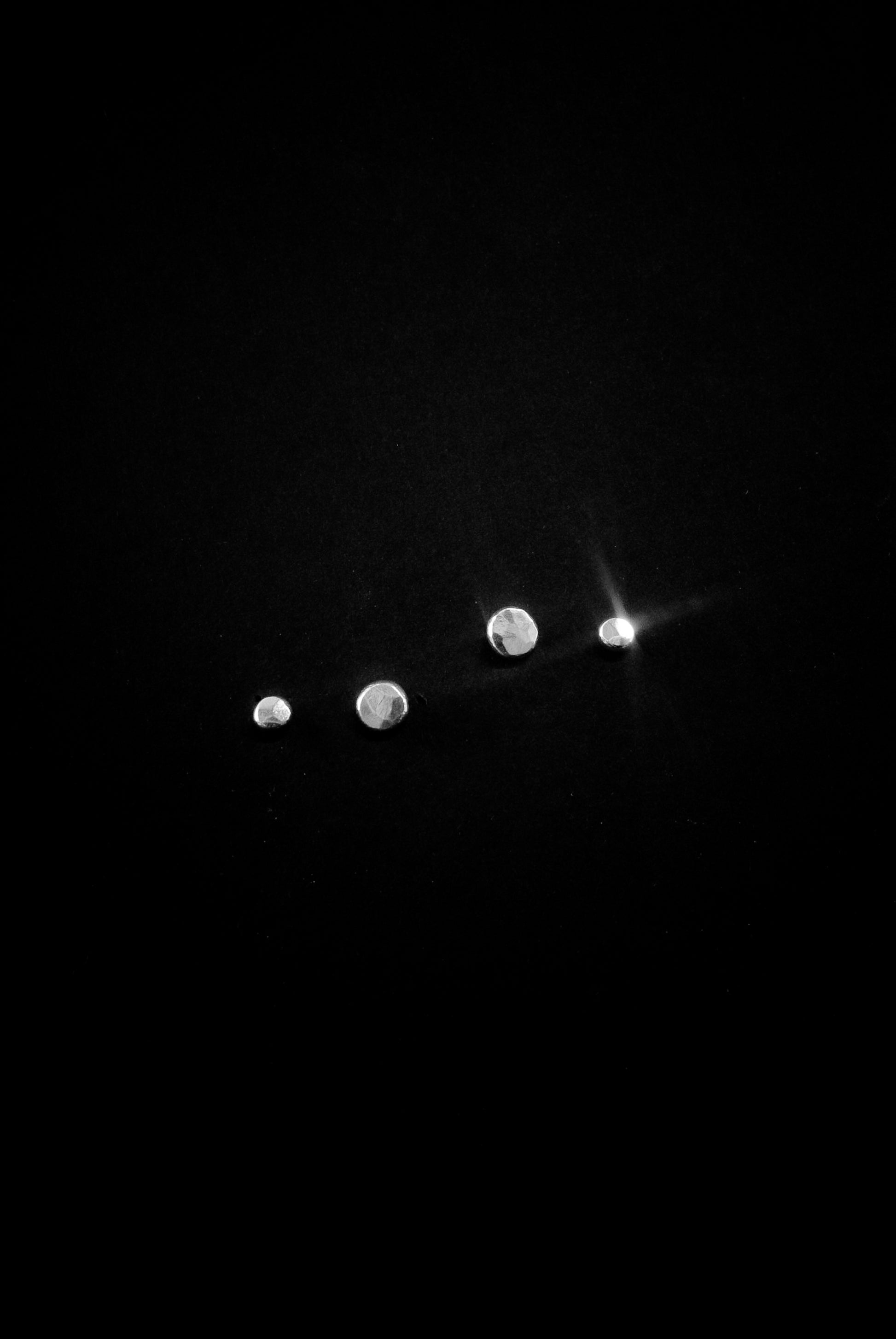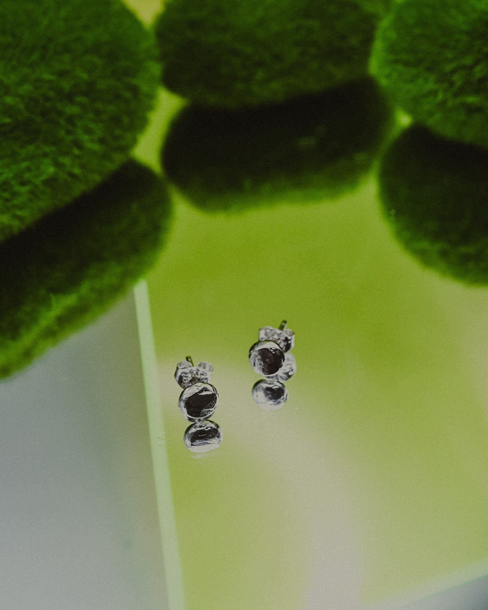 These studs are made out of hand-formed sterling silver pebbles that have been hammered and soldered to sterling silver ear posts.