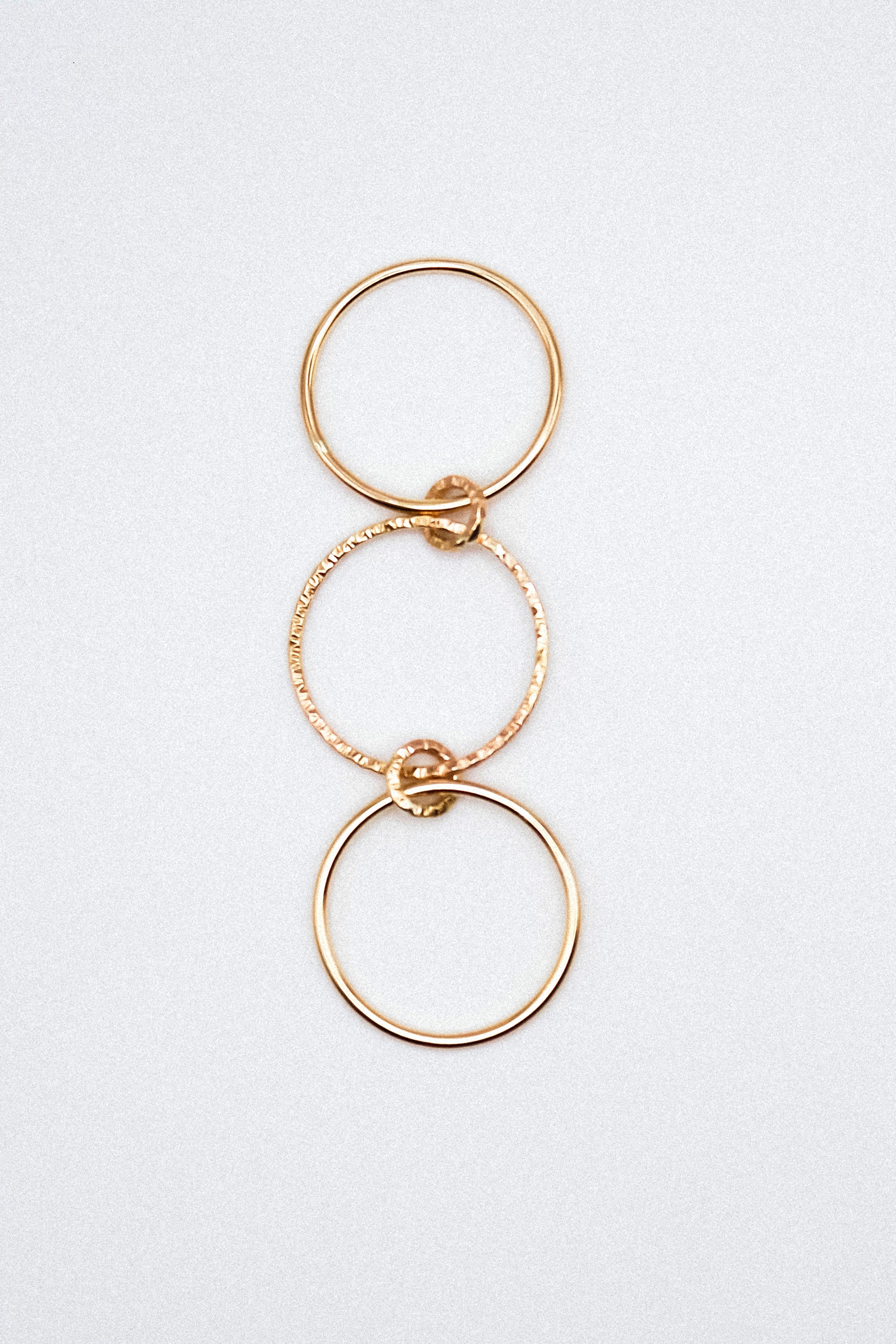 This listing is for one Ladder Link Ring made up of 3 individual stacking rings that are linked together by two small rings in our Sparkle Metal. The rings in this set are some of our signature stacking rings: 1x Thick Ring with a Hammered Finish. 1x Thick Ring with a Smooth Finish. 1x Sparkle Ring. Made from 14K Gold Fill metal. |