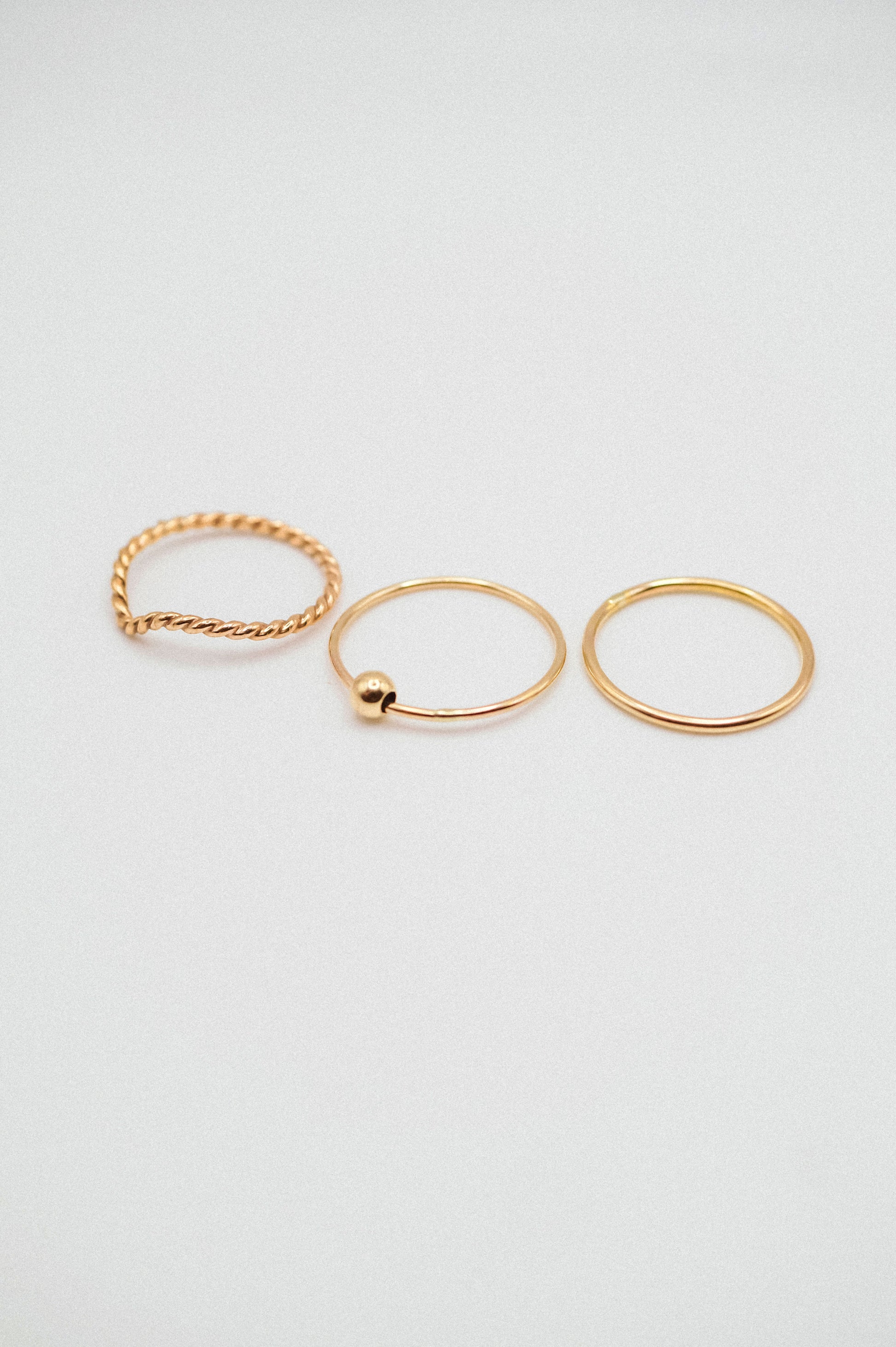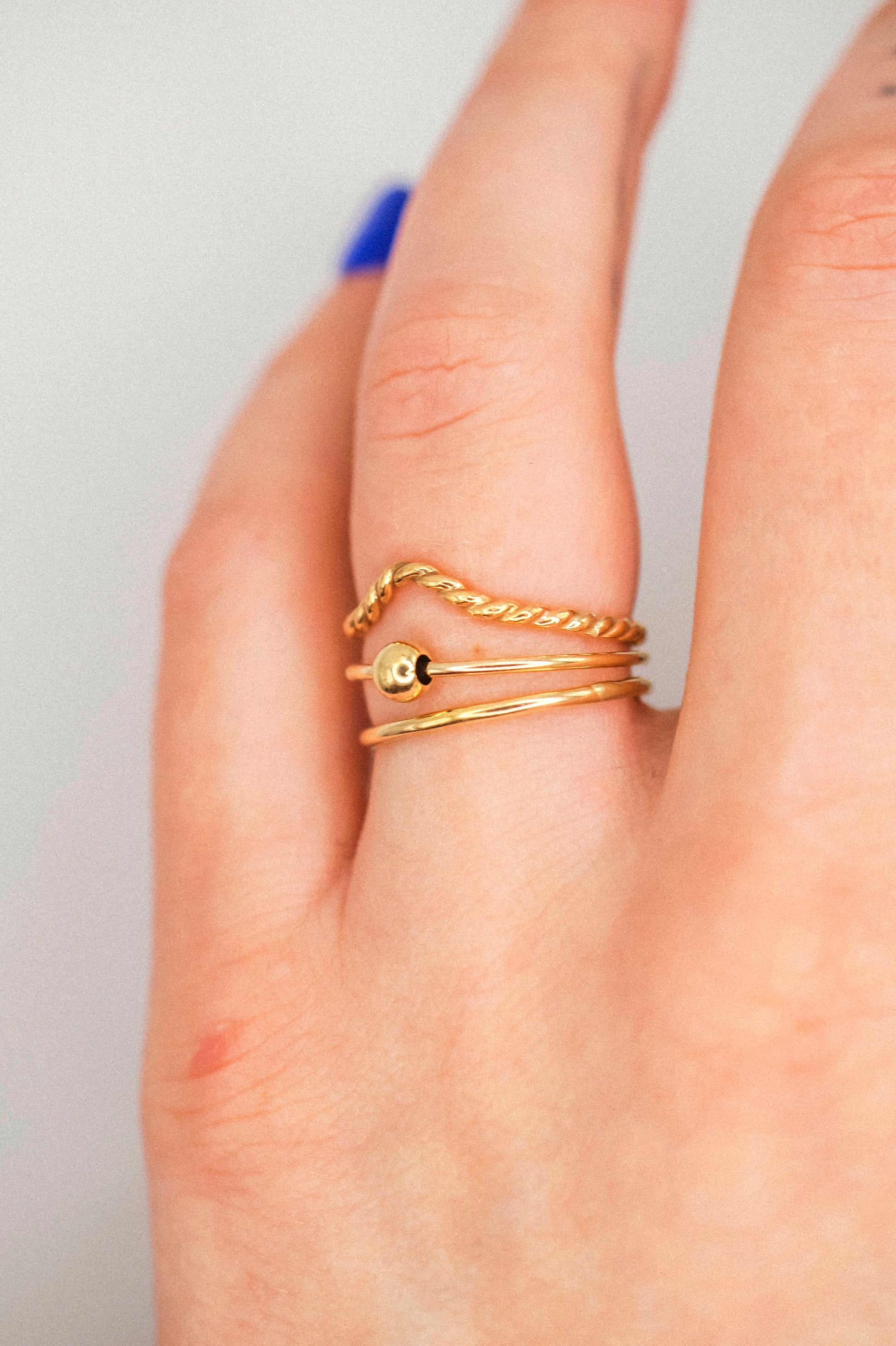 This listing is for a set of 3 rings: 1x SPINNER RING, approximately 1mm in thickness. 1x TWIST TEARDROP RING, approximately 1.65mm in thickness. 1x MEDIUM THICK RING, approximately 1mm in thickness. Made from 14K Gold Fill wire. |