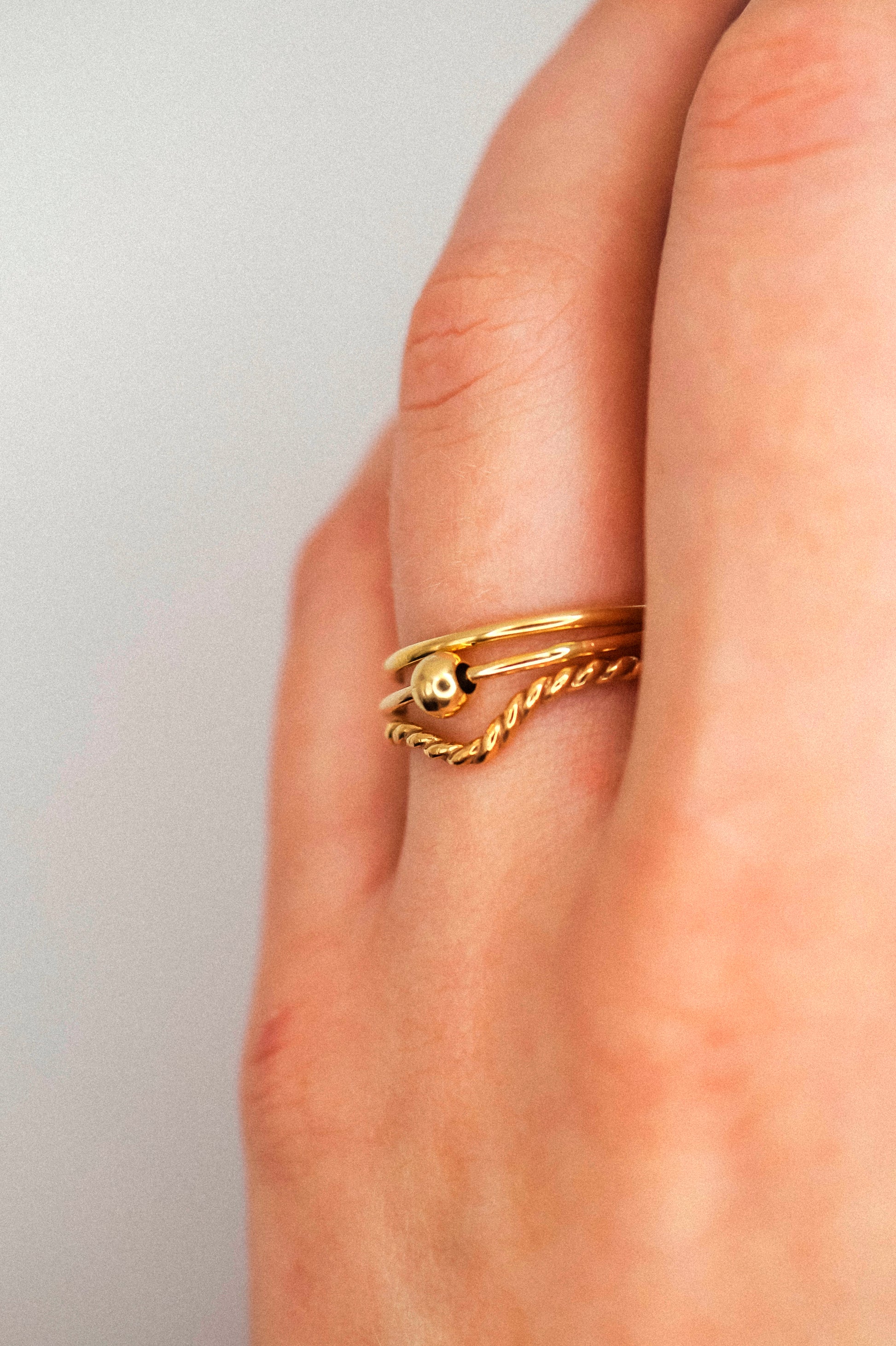 Together, this trio blends sleek minimalism with playful movement. Wear them stacked for a dynamic look or mix and match with your other favorites for endless styling options. Each ring is handcrafted for a timeless yet modern feel, making this set a versatile addition to your jewelry rotation.