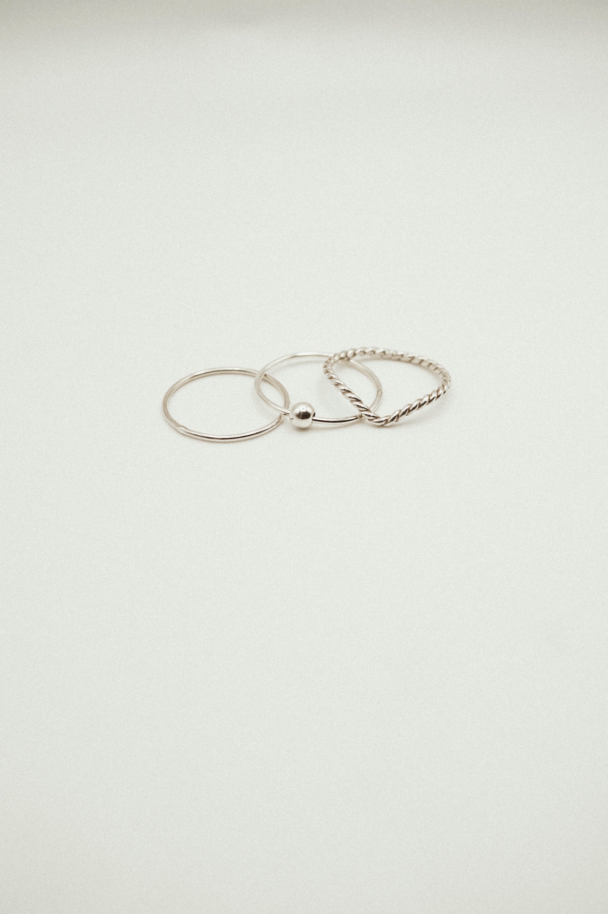 This set includes three handmade rings designed to mix texture, movement, and shine.