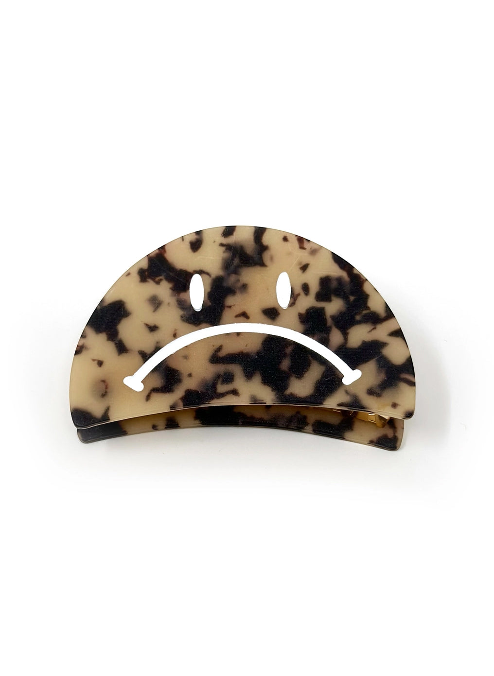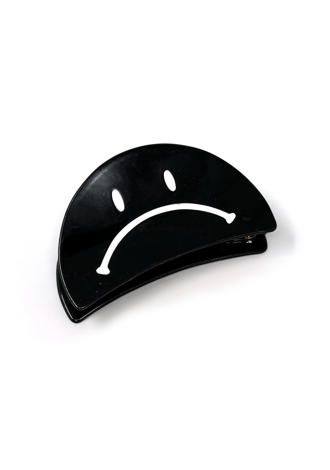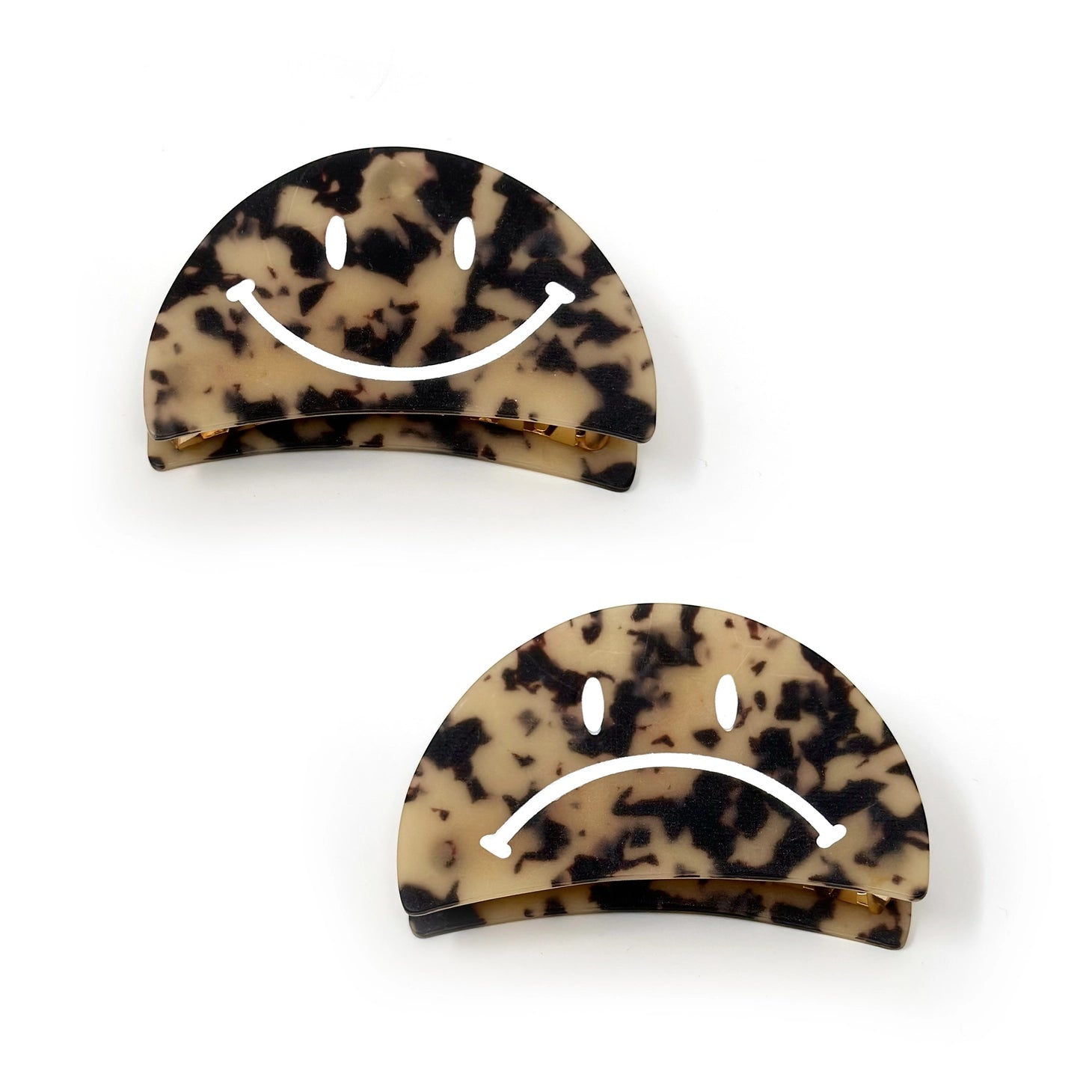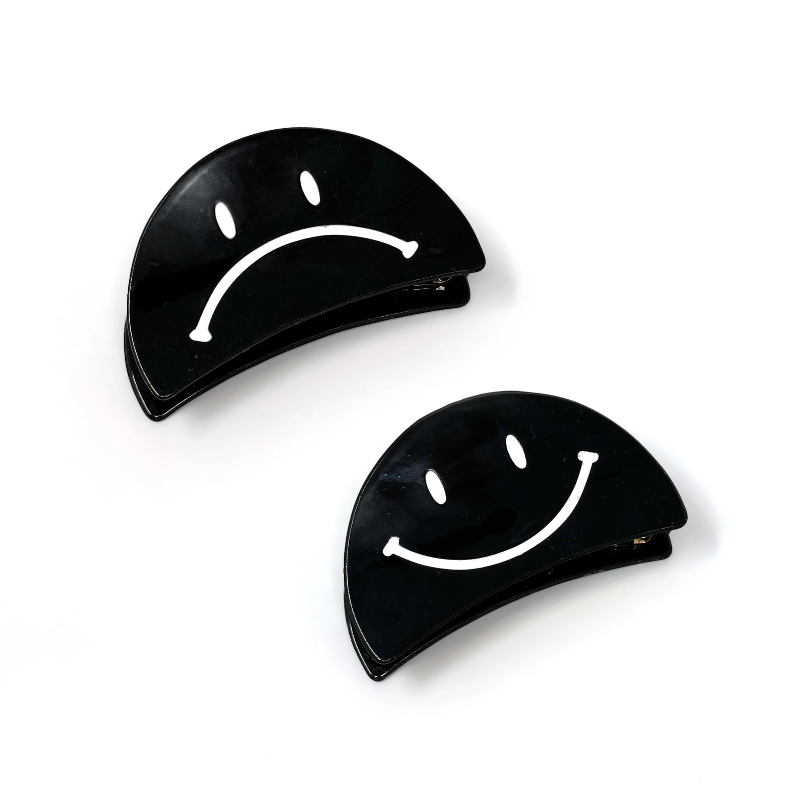 Happy & Sad Face Hair Claws! A fun take on a classic accessory. Expressive yourself! Flip your locks with ease using these playful 3.5" Happy & Sad Face Hair Claws! These quirky hair claws add a touch of personality to any outfit, making them the perfect way to express yourself (and keep your hair in place)!