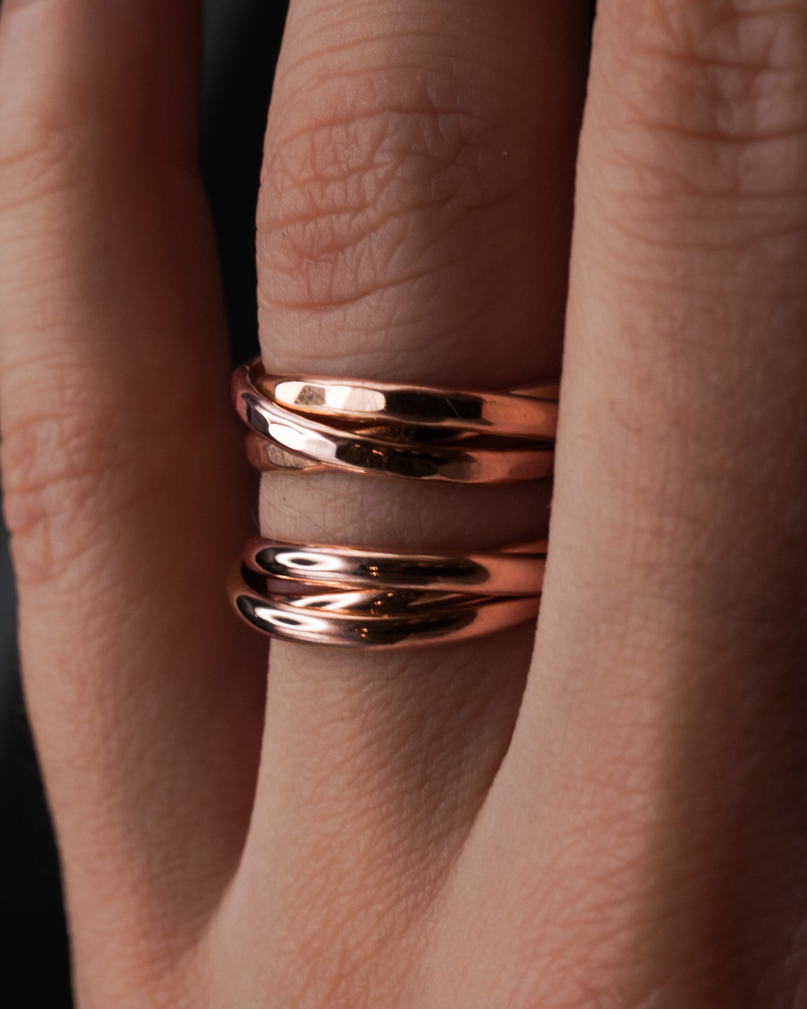 Each band measures approx. 2mm in width and is made from a D-Shaped, half round metal. This Interlocking ring set includes three 14K ROSE GOLD FILL rings. These Interlocking rings can me made in either a lightly HAMMERED finish or a SMOOTH finish. *Because these rings overlap they are meant to have some movement. We suggest sizing up by a quarter or half size. |