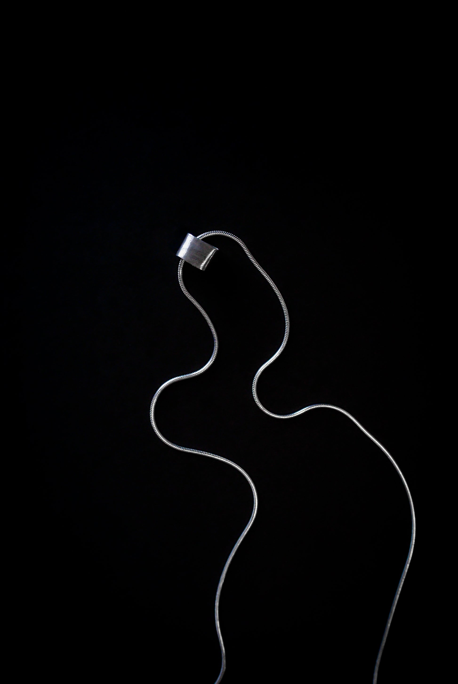 A refined necklace, adorned with a snake chain and a minimalist square cube bead pendant.