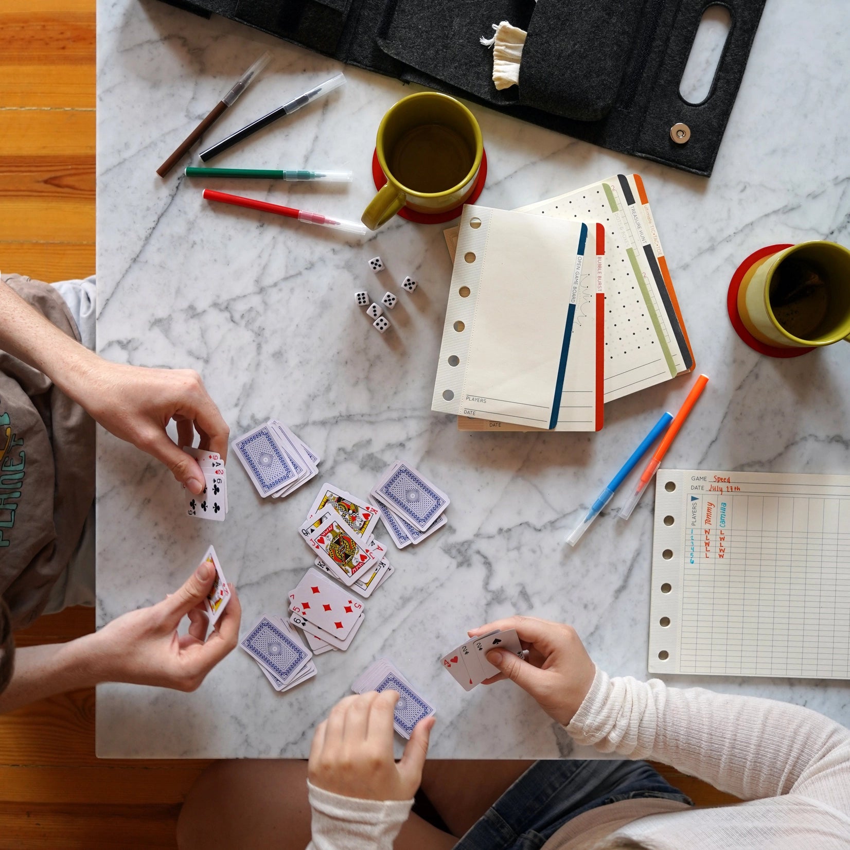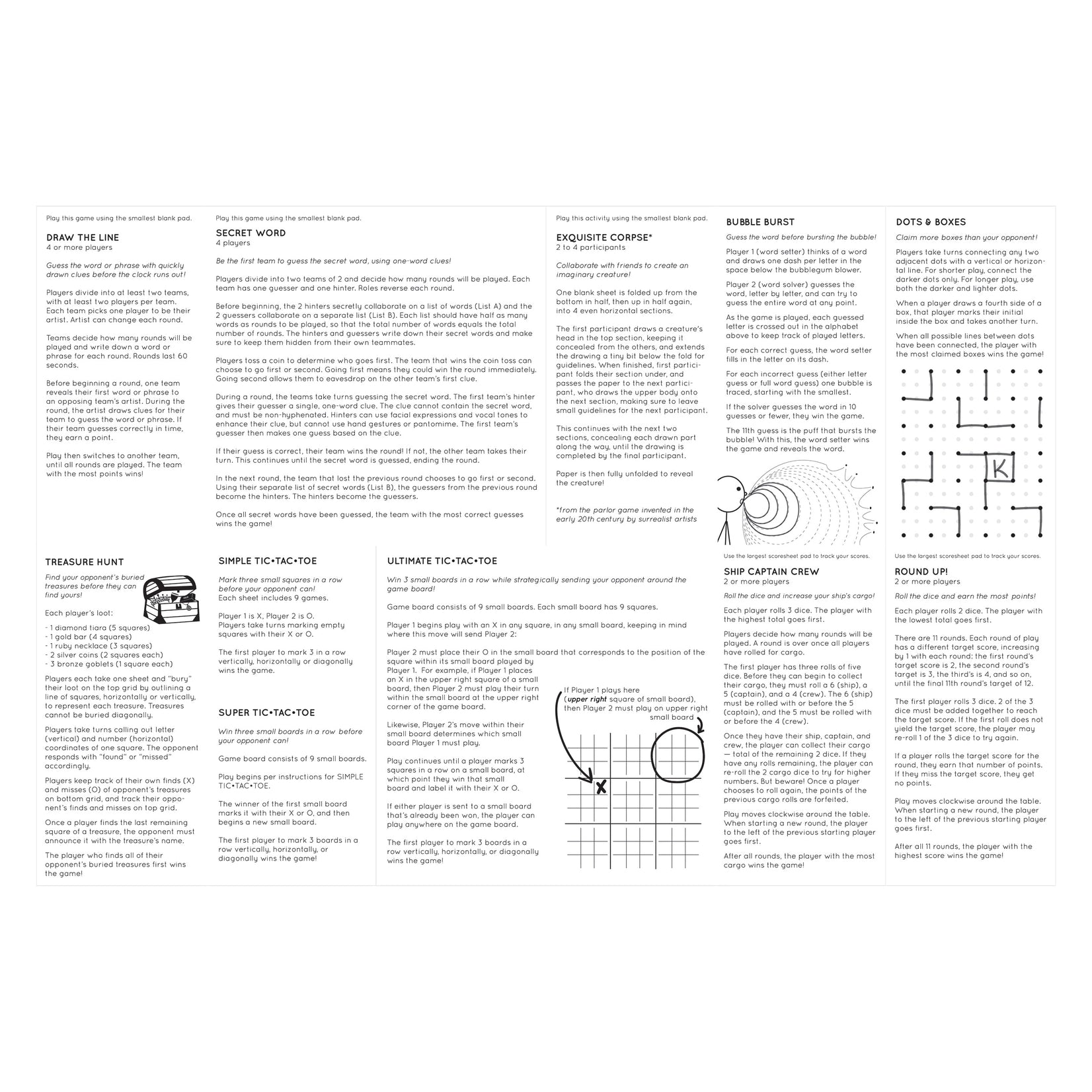 Instant fun wherever you are, no batteries required! This Portable Paper Games Set, with its six individual perforated BUBBLE BURST, DOTS & BOXES, TREASURE HUNT, ULTIMATE TIC-TAC-TOE, OPEN GAME and SCORESHEET pads, provides plenty of fun for family and friends. Six included color markers hold the stack intact when at rest. Felt carrying case and interior detachable felt pouch house pads and supplies, and the heavy-duty magnet snaps close case securely for safe travel.