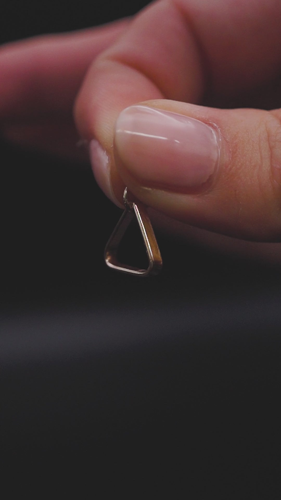 This expertly handcrafted triangle pendant is meticulously shaped and soldered at the top, resulting in one distinctly pointed angle and two gracefully rounded angles. Please note that the pendant is designed to move freely on the jump ring, so the angles will not always face the same direction.