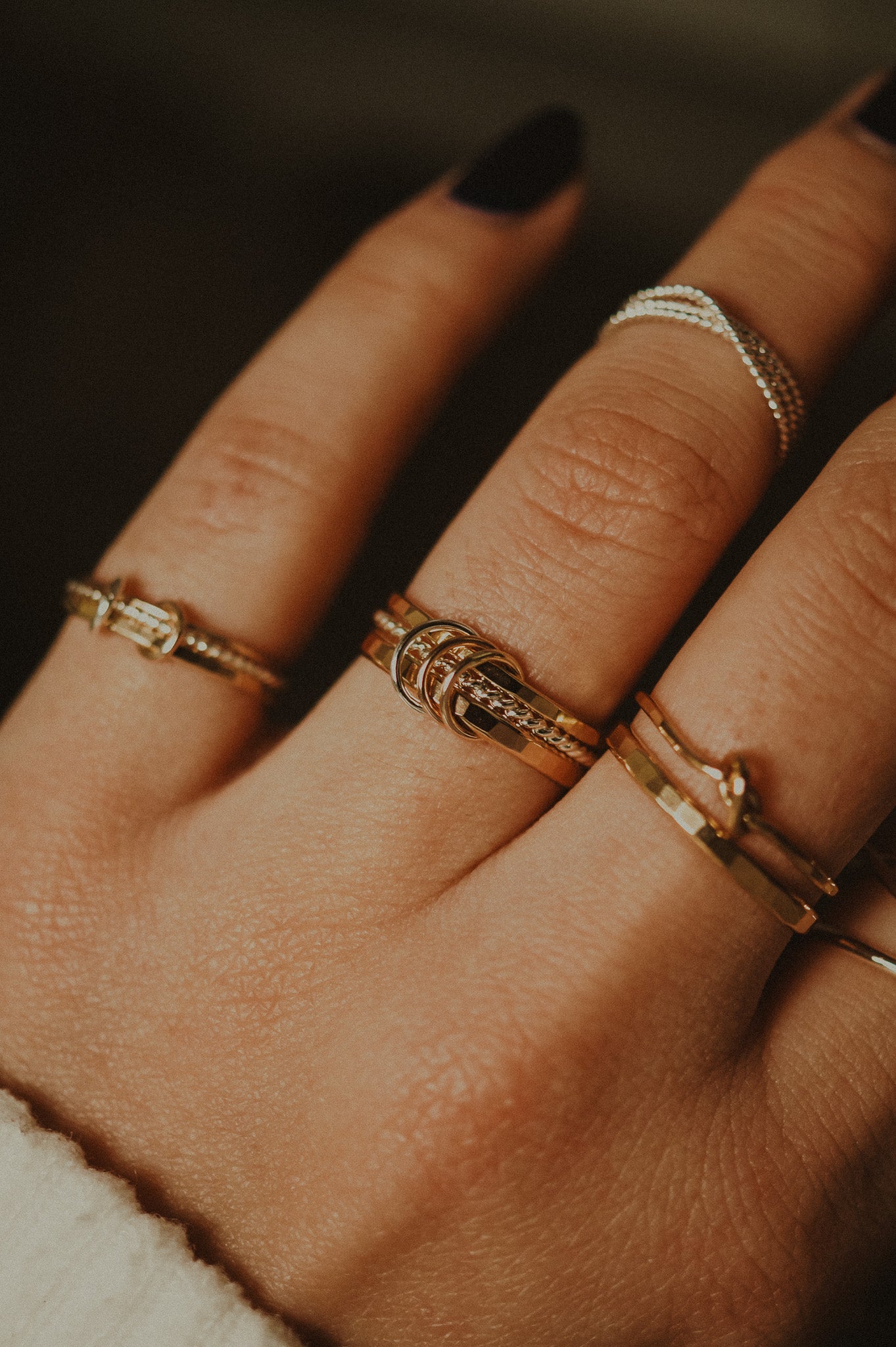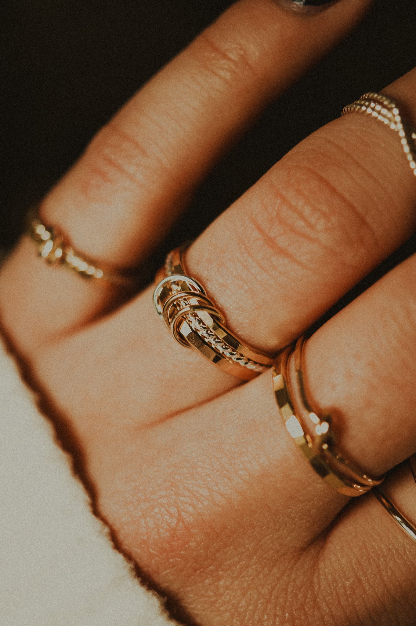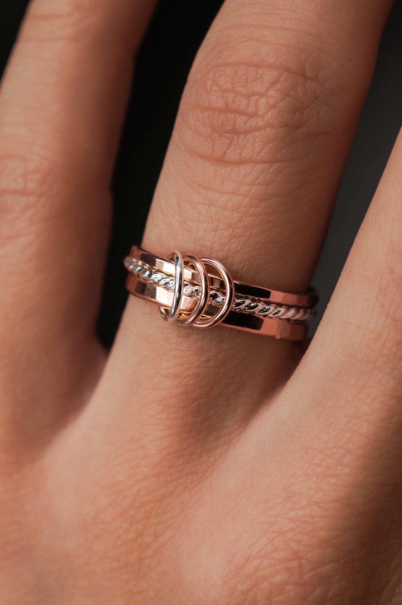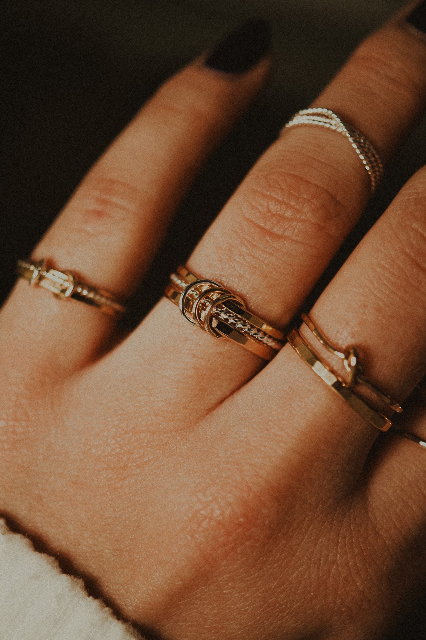 All of the rings move independently of each other and are so fun to fidget with! The three links holding the pieces together are so satisfying to play with, too - you'll want to spin, flip and roll this ring all day long! The entire Link Ring collection makes perfect stacking rings when worn with other pieces.
