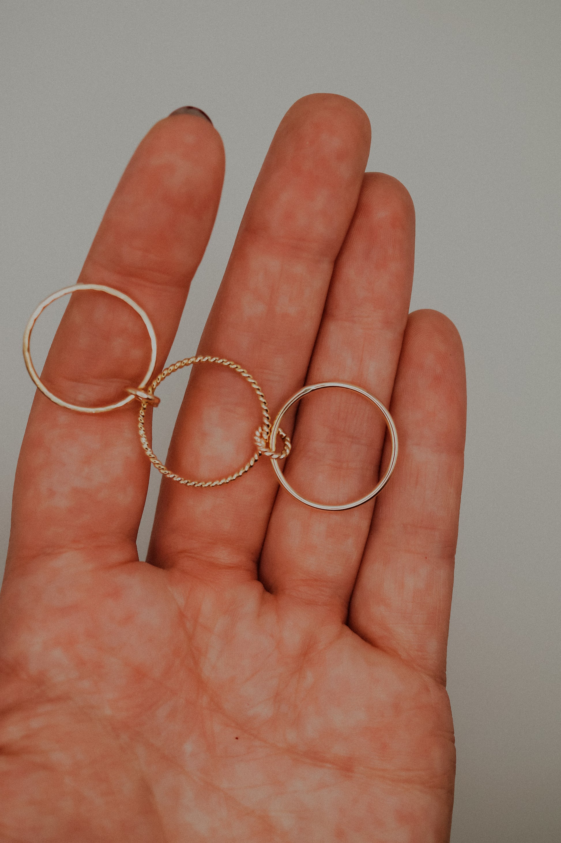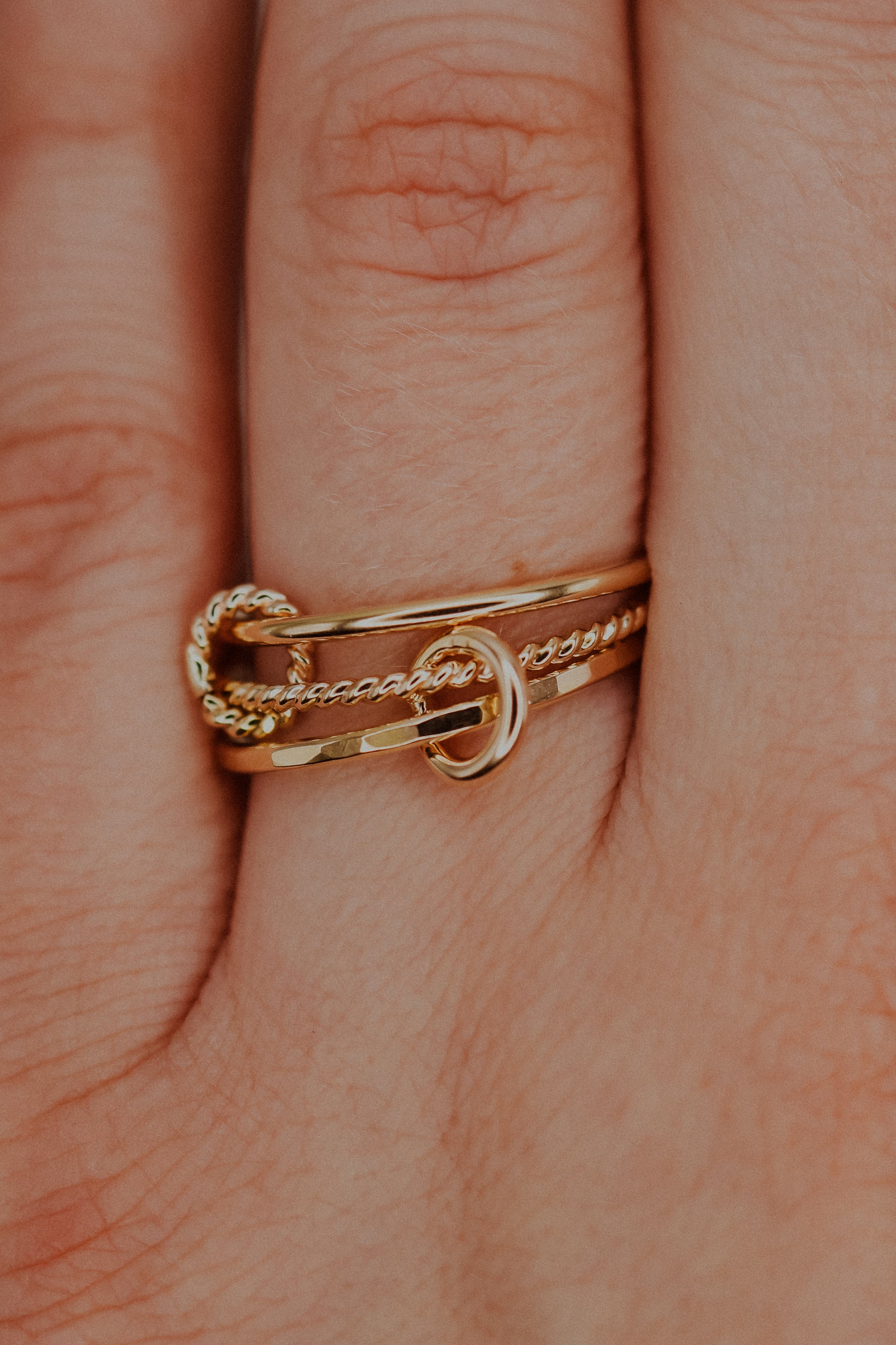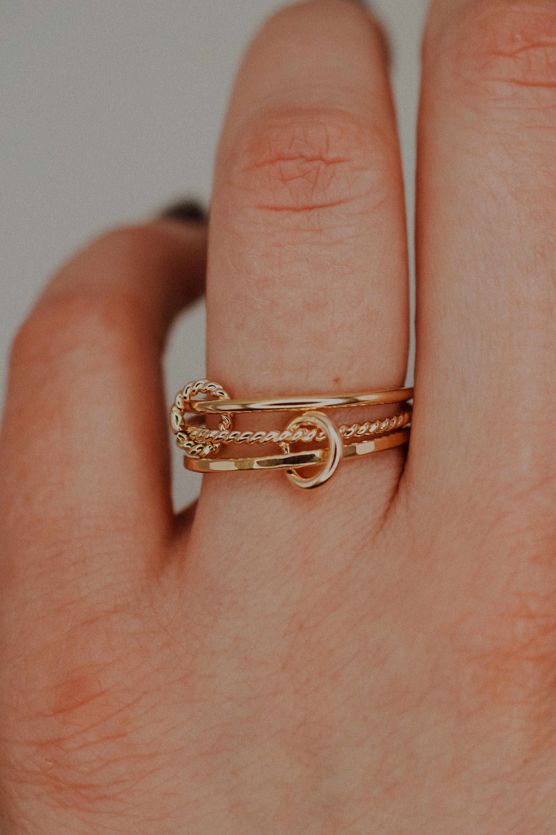 This listing is for one Ladder Link Ring made up of 3 individual stacking rings that are linked together by two small rings, one in our Thick Twist Metal and one in a Smooth Finish. The rings in this set are some of our signature stacking rings: 1x Thick Ring with a Hammered Finish. 1x Thick Ring with a Smooth Finish. 1x Thick Twist Ring Ring. Made from 14K Gold FIll. |