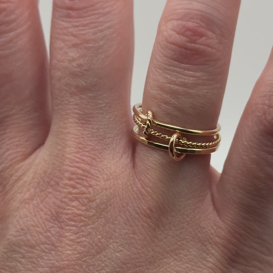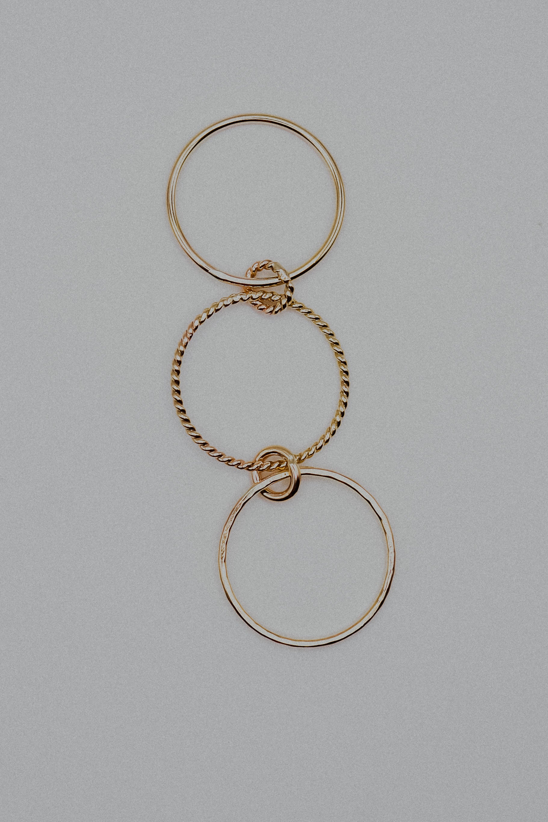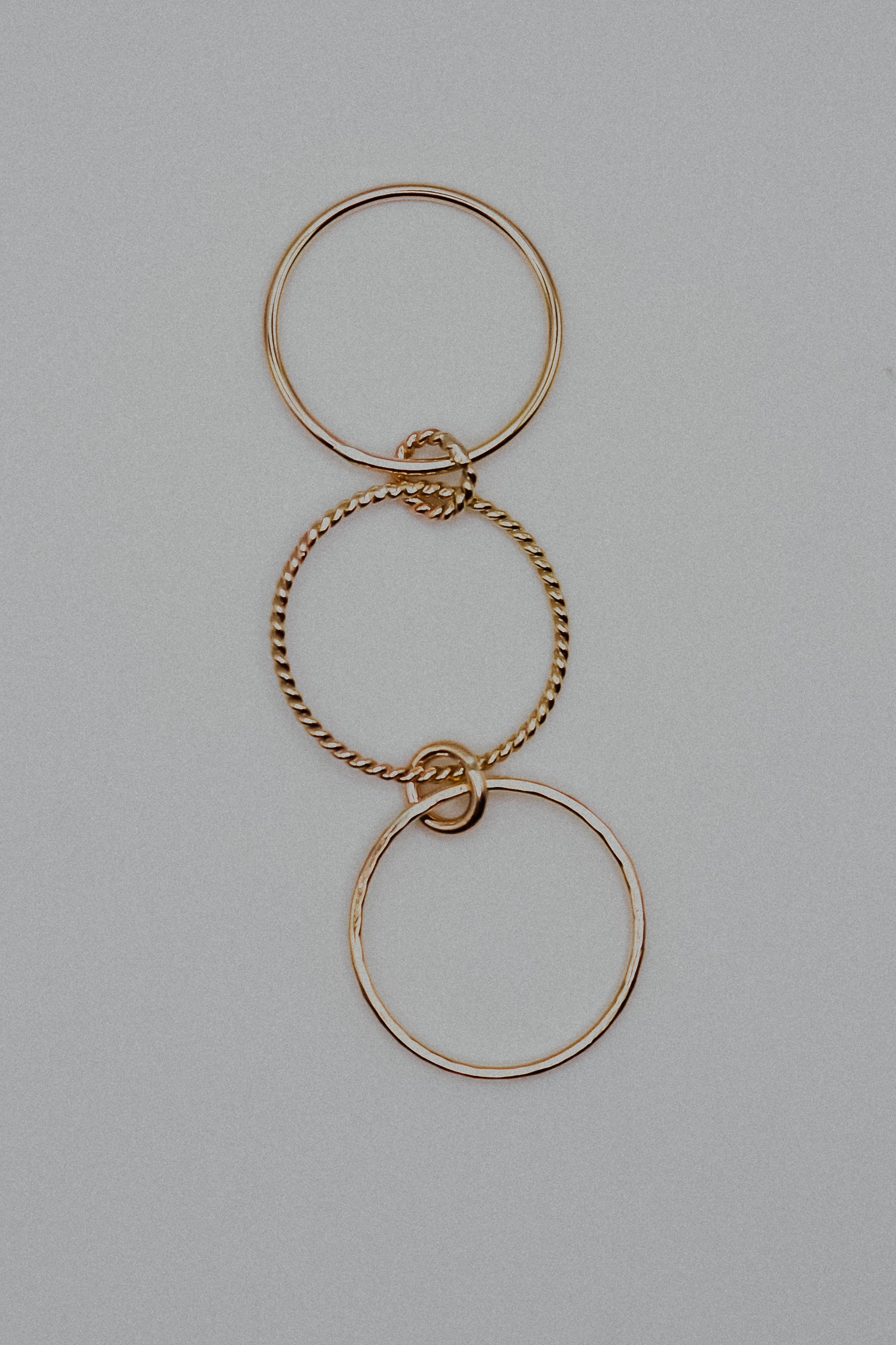 This listing is for one Ladder Link Ring made up of 3 individual stacking rings that are linked together by two small rings, one in our Thick Twist Metal and one in a Smooth Finish. The rings in this set are some of our signature stacking rings: 1x Thick Ring with a Hammered Finish. 1x Thick Ring with a Smooth Finish. 1x Thick Twist Ring Ring. Made from 14K Gold FIll. |