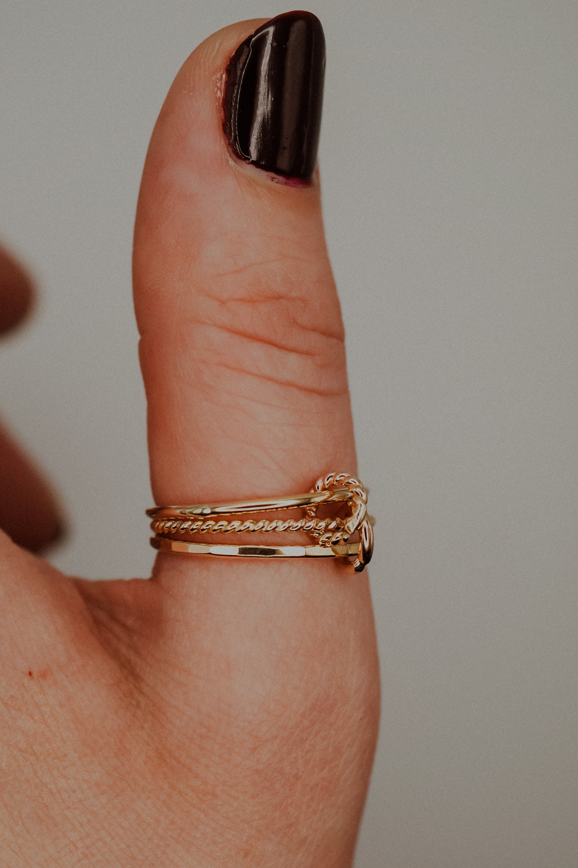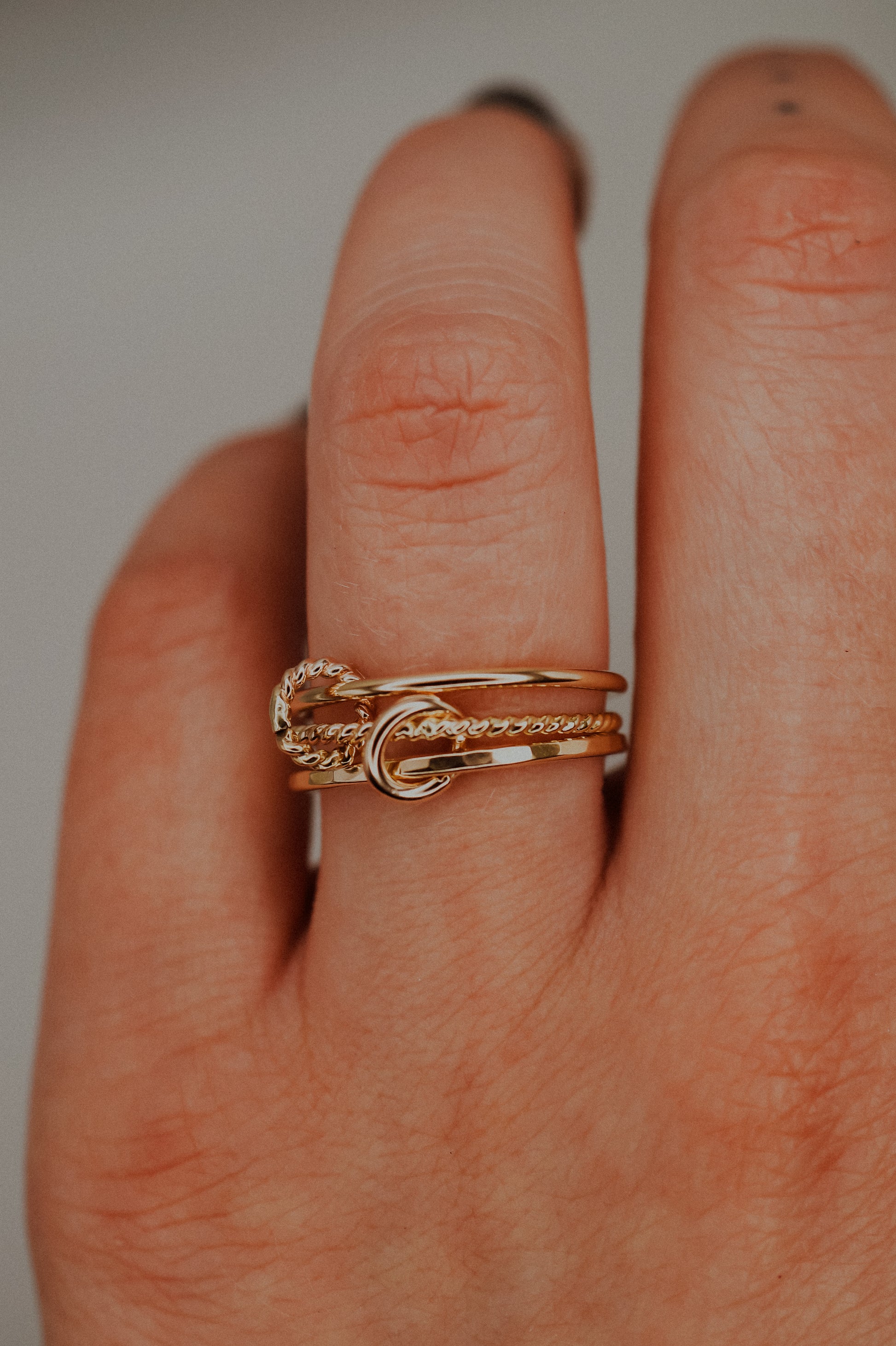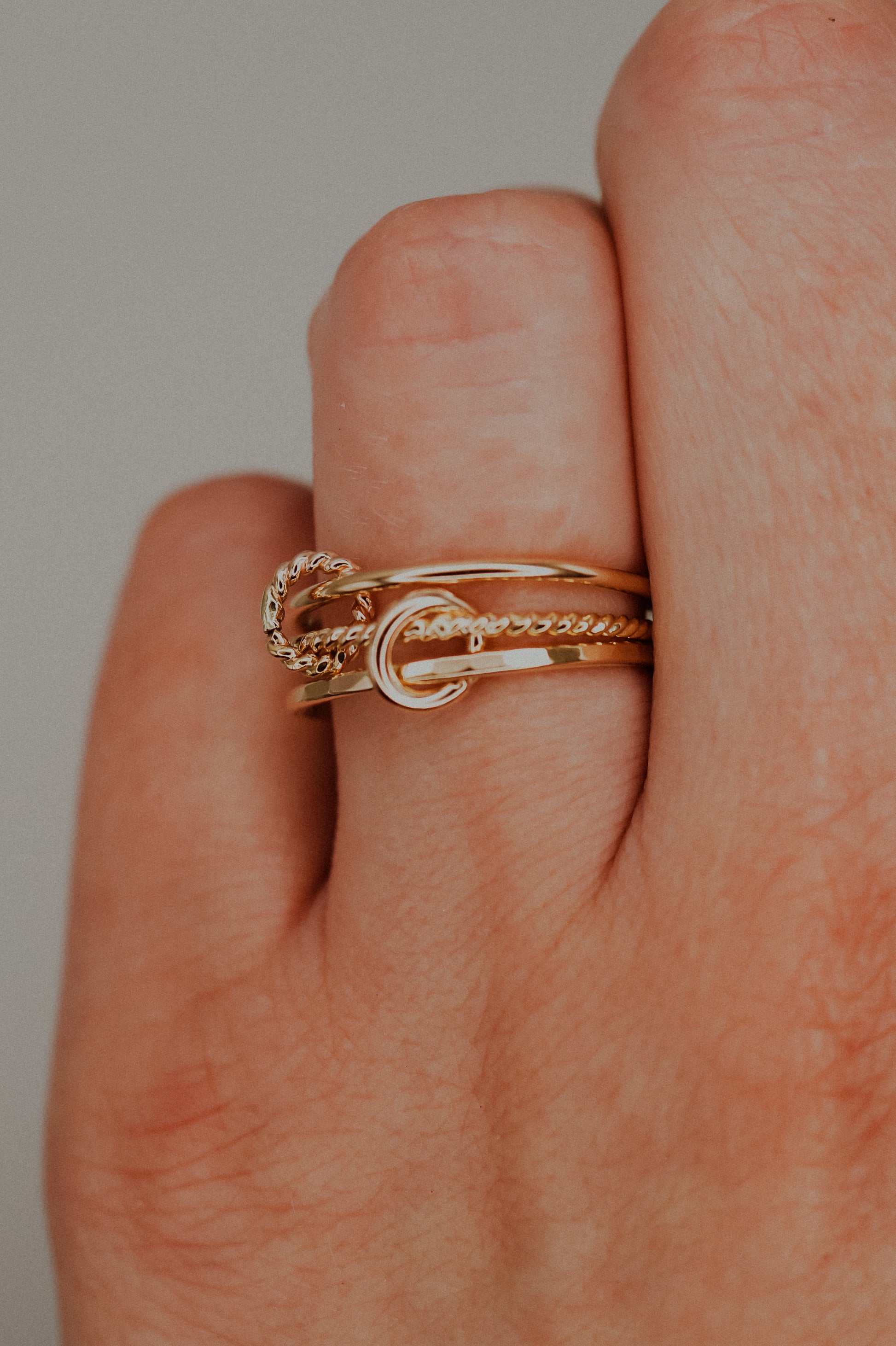 The mix of textures is what makes this piece shine: featuring both our classic stacking rings and our fan-fave Twist Ring! Together, they create a dynamic, light-catching stack that feels both minimal and edgy.
