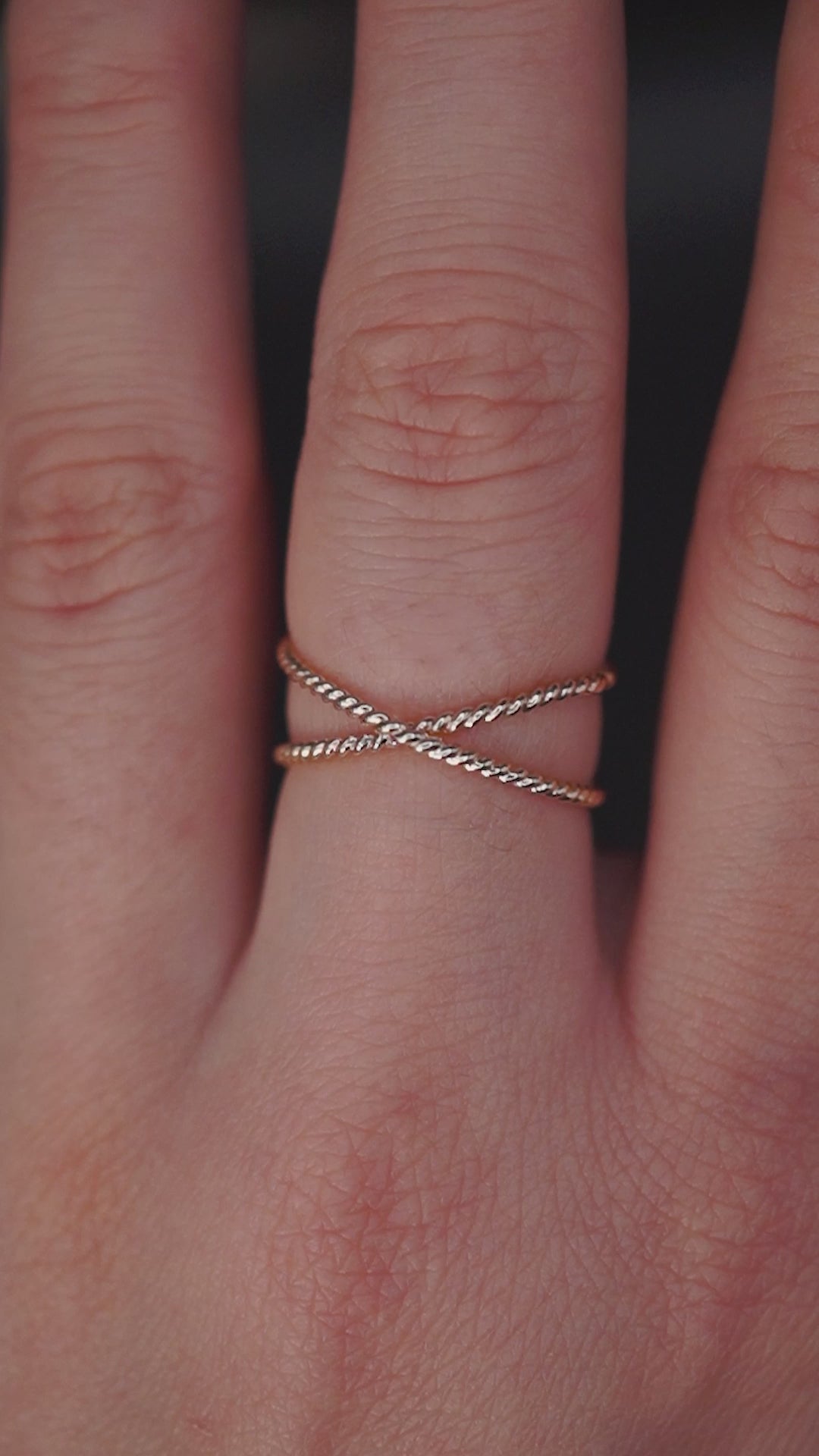 To create this design, we wrap a length of metal around two times in a criss-cross X design and securely solder it around back. The beauty of this ring lies in its organic shape, we can never make exactly the same ring twice!