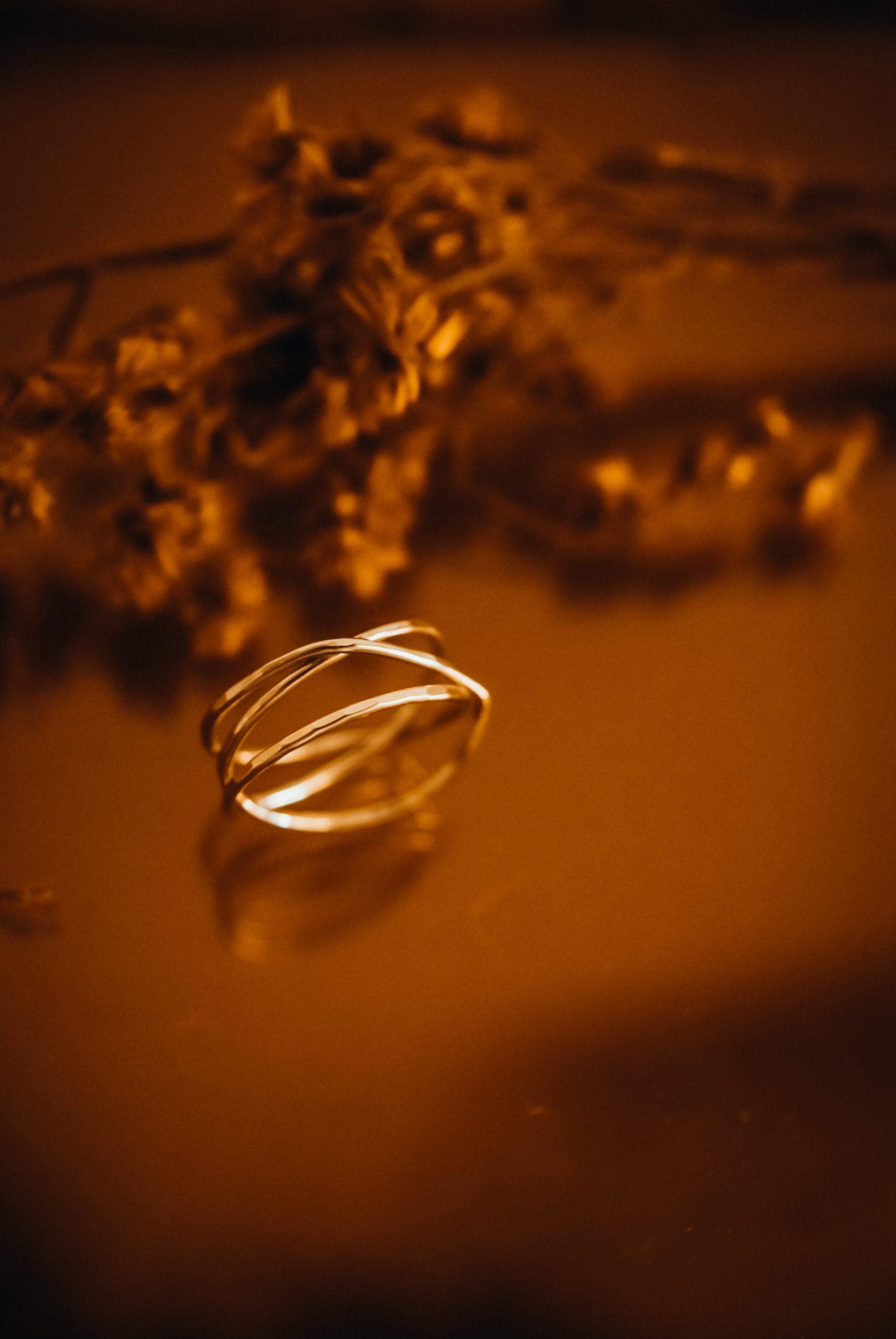 We wrap a long length of metal around three times and securely solder it around back. Then we lightly hammered the ring for a bright, reflective shine.